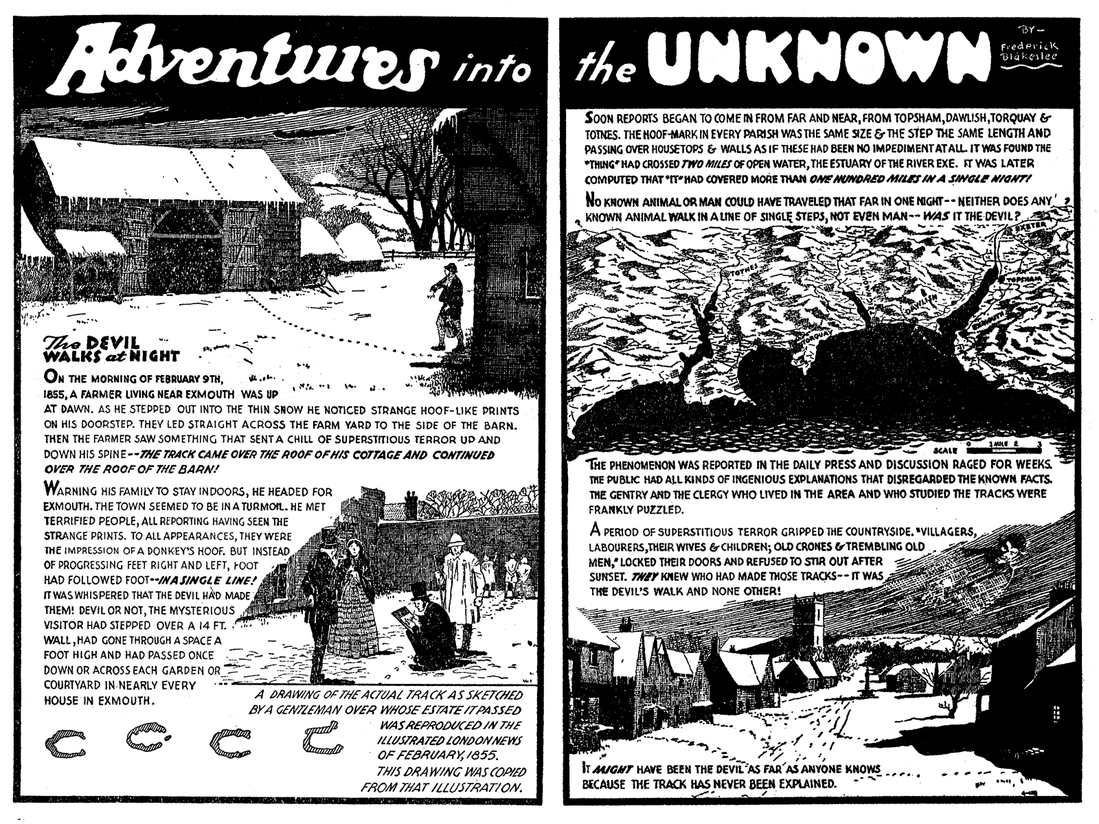 “Adventures Into The Unknown!” Blakeslee published fourteen installments of his two-page illustrated looks into the Unknown between March 1948 and October 1950. This time around Mr. Blakeslee delves into possible evidence of the Devil appearing on a cold snowy night in 1855 in Exmouth—from the April 1949 issue of Dime Mystery Magazine it’s “Adventures Into The Unknown: The Devil Walks at Night!”