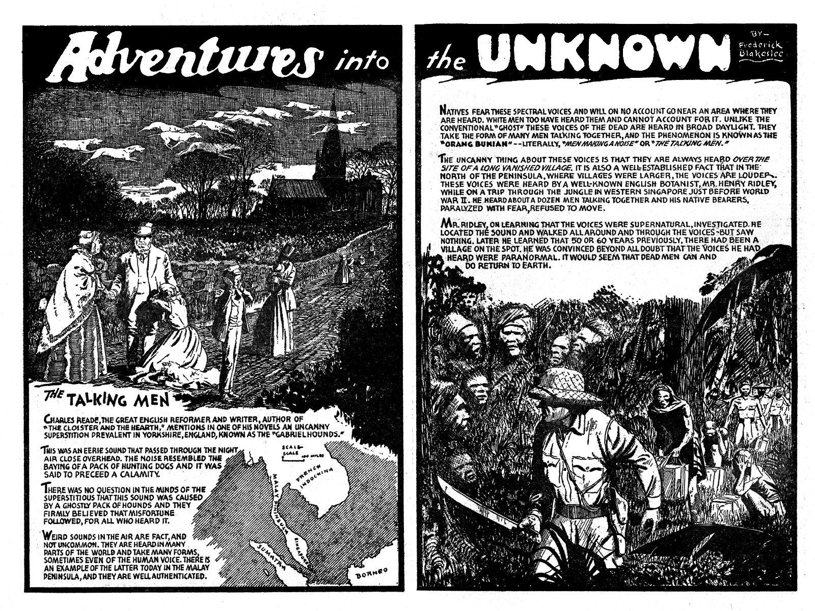 “Adventures Into The Unknown!” Blakeslee published fourteen installments of his two-page illustrated looks into the Unknown between March 1948 and October 1950. This time around Mr. Blakeslee examines the phenomenon known as ‘Orang Bunian’—or ‘the Talking Men.’ It is the hearing of the voices of the dead in broad daylight—usually over the site where there had once been a village! From the August 1949 issue of Dime Mystery Magazine it’s “Adventures Into The Unknown: The Talking Men!”