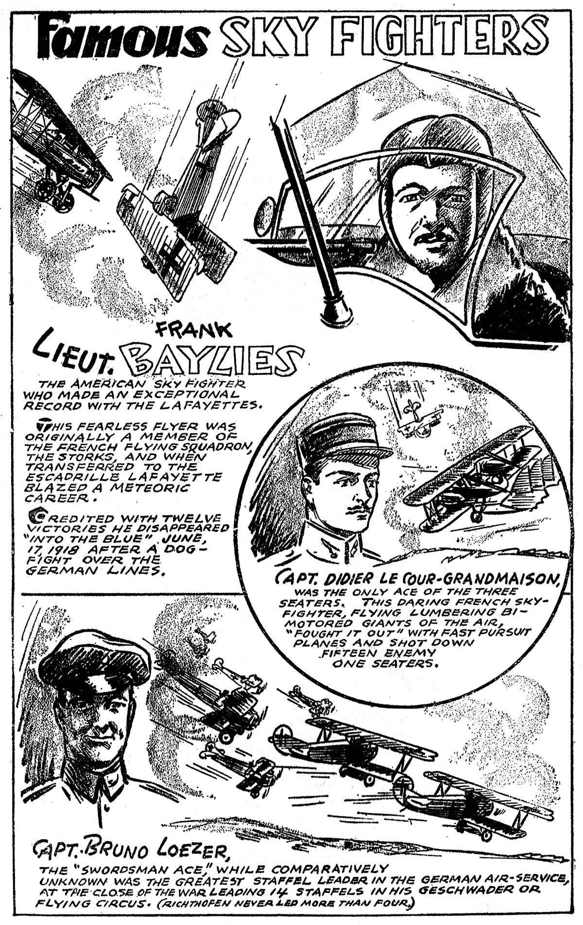The September 1934 installment, from the pages of Sky Fighters, Features Lt. Frank Baylies, Lieut.Charles Nungesser, and Capt. Bruno Loezer—”The Swordsman Ace”!
