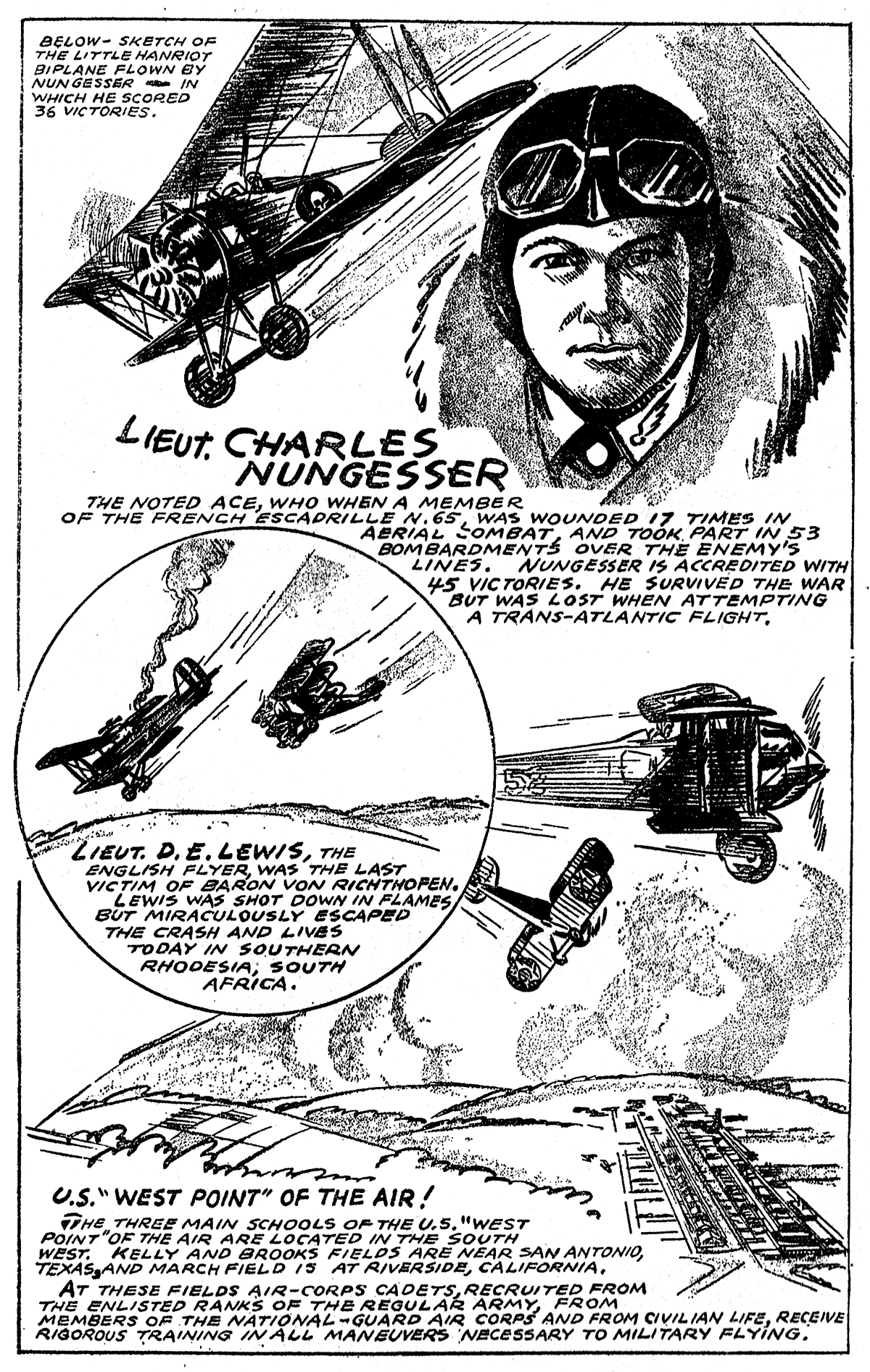 STARTING in the October 1933 issue of Sky Fighters and running almost 5 years, Terry Gilkison’s “Famous Sky Fighters†was a staple of the magazine. Each month Gilkison would illustrate in a two page spread different Aces that rose to fame during the Great War.