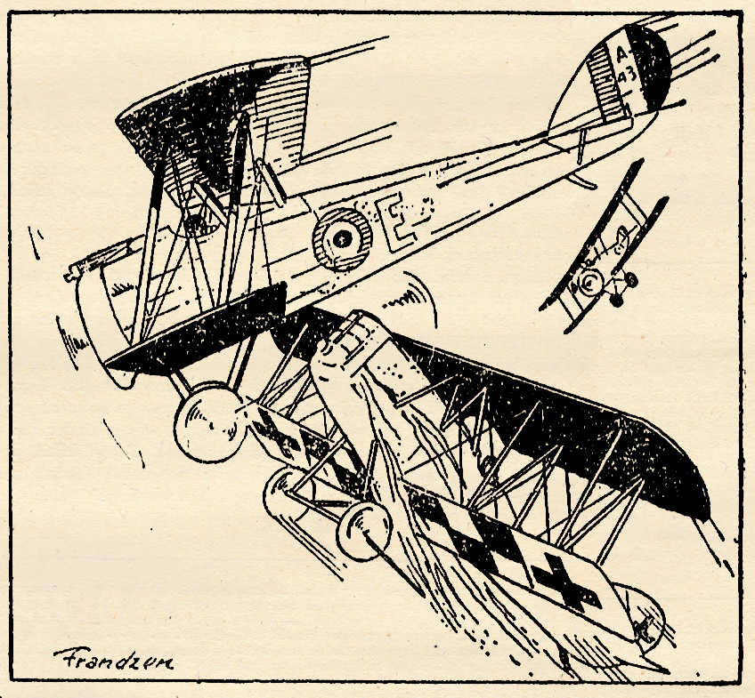 They did exactly this and then as the Hun was about to swing his fast ship around and barge back at the Yanks he found twin streams of lead boring into his ship, one stream from each single gun mounted on the front of the two D.Hs. A couple of those slugs got the gas tank. The engine sputtered, a tiny whisp of flame swept back, then suddenly the whole front of the engine cowling belched flames. One D.H. flashed by the German, whose ship was now slowed down under the speed of his enemy. The German yanked at his stick. If he could only climb his ship enough he’d ram the Yank with his flaming crate, take him with him on his death dive. But don’t worry, he didn’t do it because his opponents were only giving him a last salute before starting for home, giving him a chance for a last crack at them, but in doing it they didn’t take any chances of being shot down.