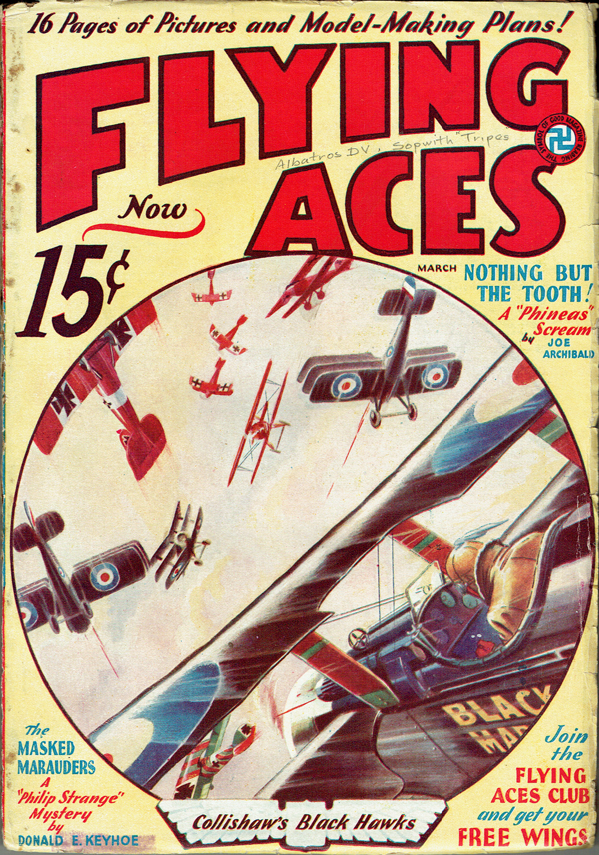 THIS week we present “Collishaw’s Black Hawks”—The story behind the cover of Paul Bissell’s March 1933 cover for Flying Aces! Bissell is mainly known for doing the covers of Flying Aces from 1931 through 1934 when C.B. Mayshark took over duties. For the March 1933 cover Bissell put us right in the action on that June day in 1917 as Canadian Ace Raymond Collishaw and his Black Flight tangle in a deadly dogfight with Richthofen’s Flying Circus—now lead by his deputy, German Ace Karl Allmenroeder who already had 30 victories to his name!