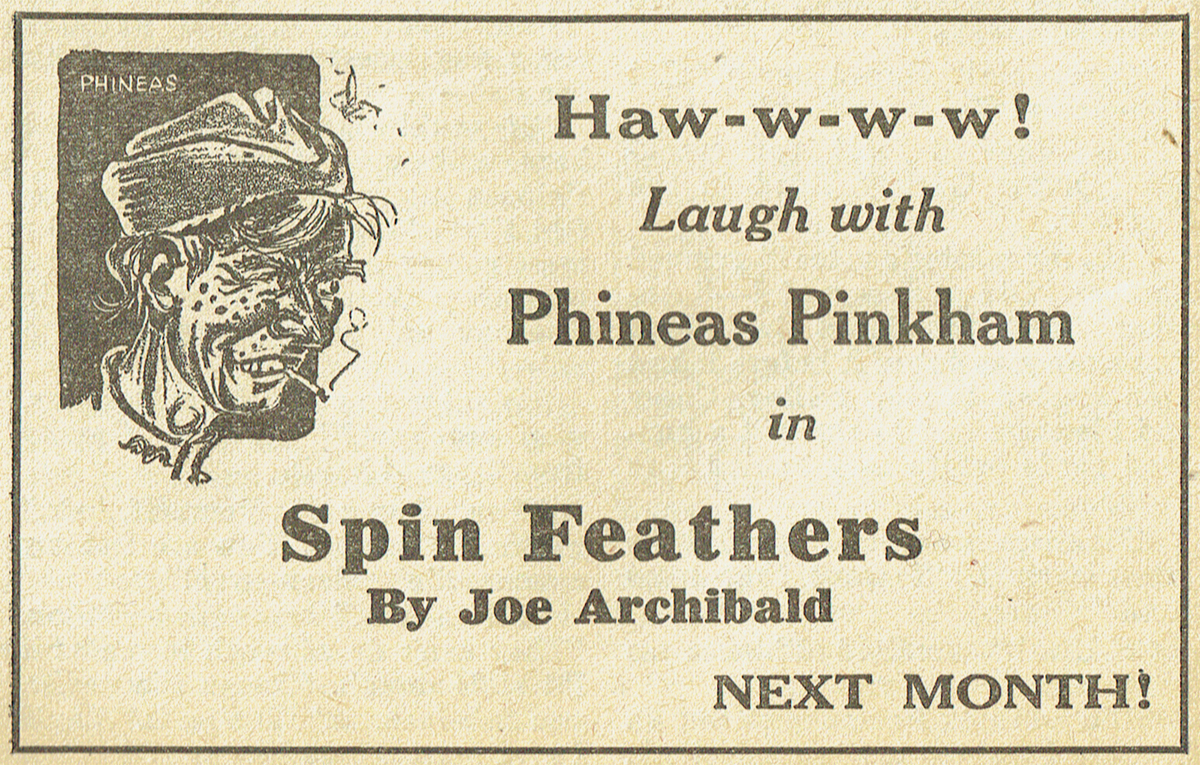 This month we’re celebrating the talents of that pulp stalwart—Joe Archibald. Archibald wrote hundreds of stories for the pulps, both dramatic and humorous. His bread and butter it would seem was the humorous tale. He had long running series in several pulp titles. In the detective titles there was Alvin Hinkey, the harness bull Hawkshaw, in 10 Story Detective; Scoops & Snooty, the Evening Star’s dizzy duo, in Ten Detective Aces; and the President of the Hawkeye Detective Agency himself—Willie Klump in Popular Detective. While in the aviation titles he had Elmer Hubbard and Pokey Cook in Sky Birds; the pride of Booneville—Phineas Pinkham in Flying Aces; and the one-two punch of Ambrose Hooley & Muley Spinks in The Lone Eagle, The American Eagle, Sky Fighters and War Birds!