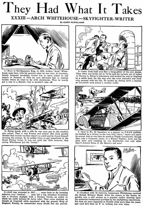Seventy years ago this month Flying Aces magazine ran an illustrated profile of Whitehouse’s life, including his exploits as a WWI pilot. Here it is as it appeared in the October 1939 issue.