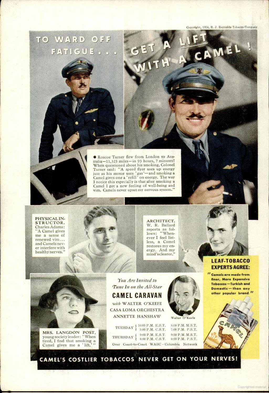 Alden McWilliams’ monthly illustrated tribute to the pioneer fliers of the early days of aviation which was called “They Had What it Takesâ€. In the May 1939 issue they featured the “dashing racing Ace” Roscoe Turner! Roscoe learned to fly during WWI and started barnstorming in the 20’s which led into air racing. A triple winner of the Thompson Trophy, Turner was sponsored by the Gilmore Oil Company who provided him with a lion cub named “Gilmore” (complete with his own cub-sized parachute) for publicity reasons. Turner frequently took Gilmore on tour with him.