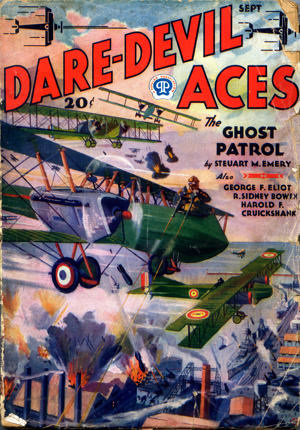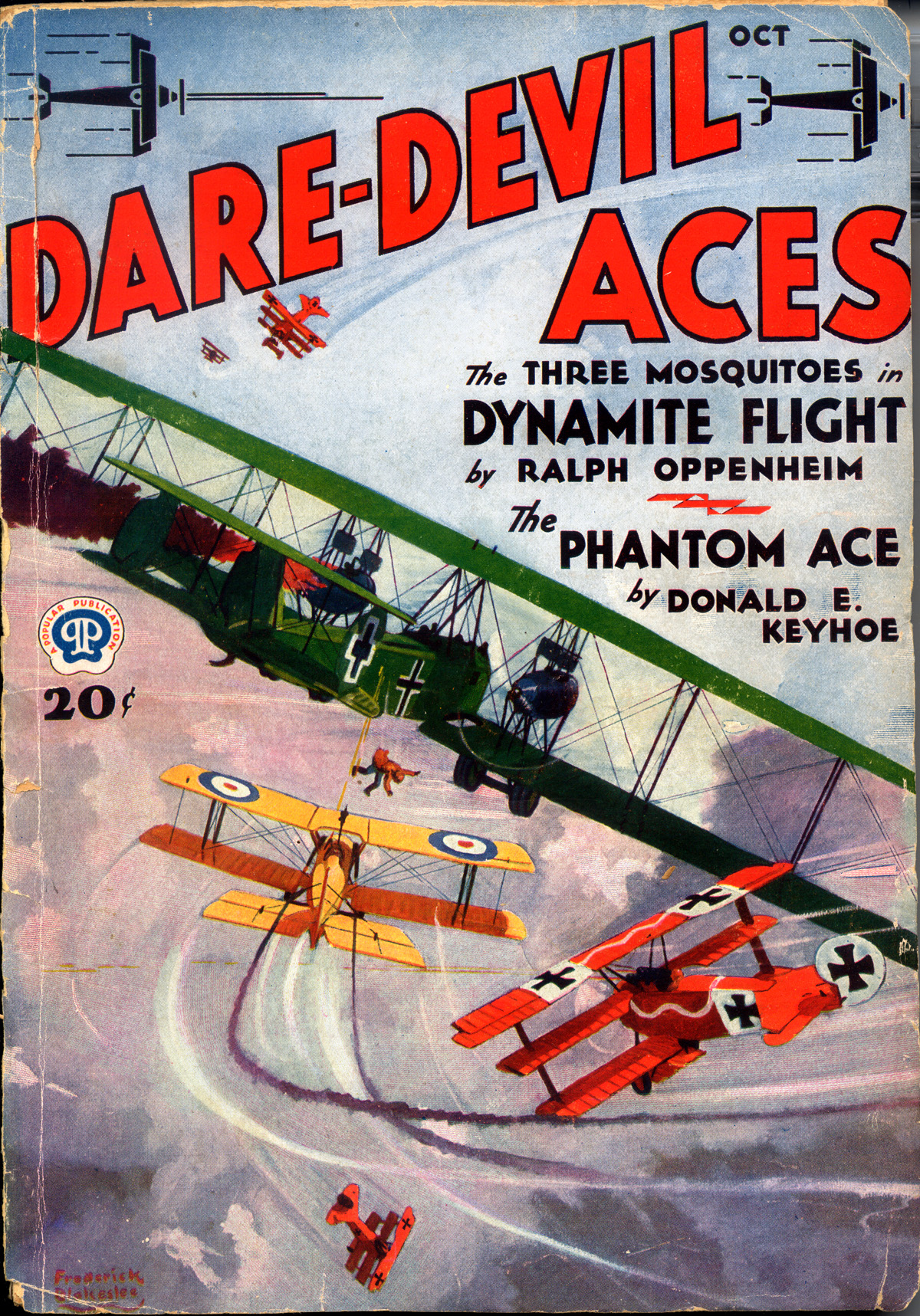 Back with another of Frederick Blakeslee’s “The Story Behind The Cover.” Each issue of Popular Publication’s Dare-Devil Aces had a fantastic scene of air combat gracing its cover. Frederick Blakeslee painted all 135 covers—and each had a story behind it. This is the story behind the cover of the October 1932 issue—”The Giant Bomber”…