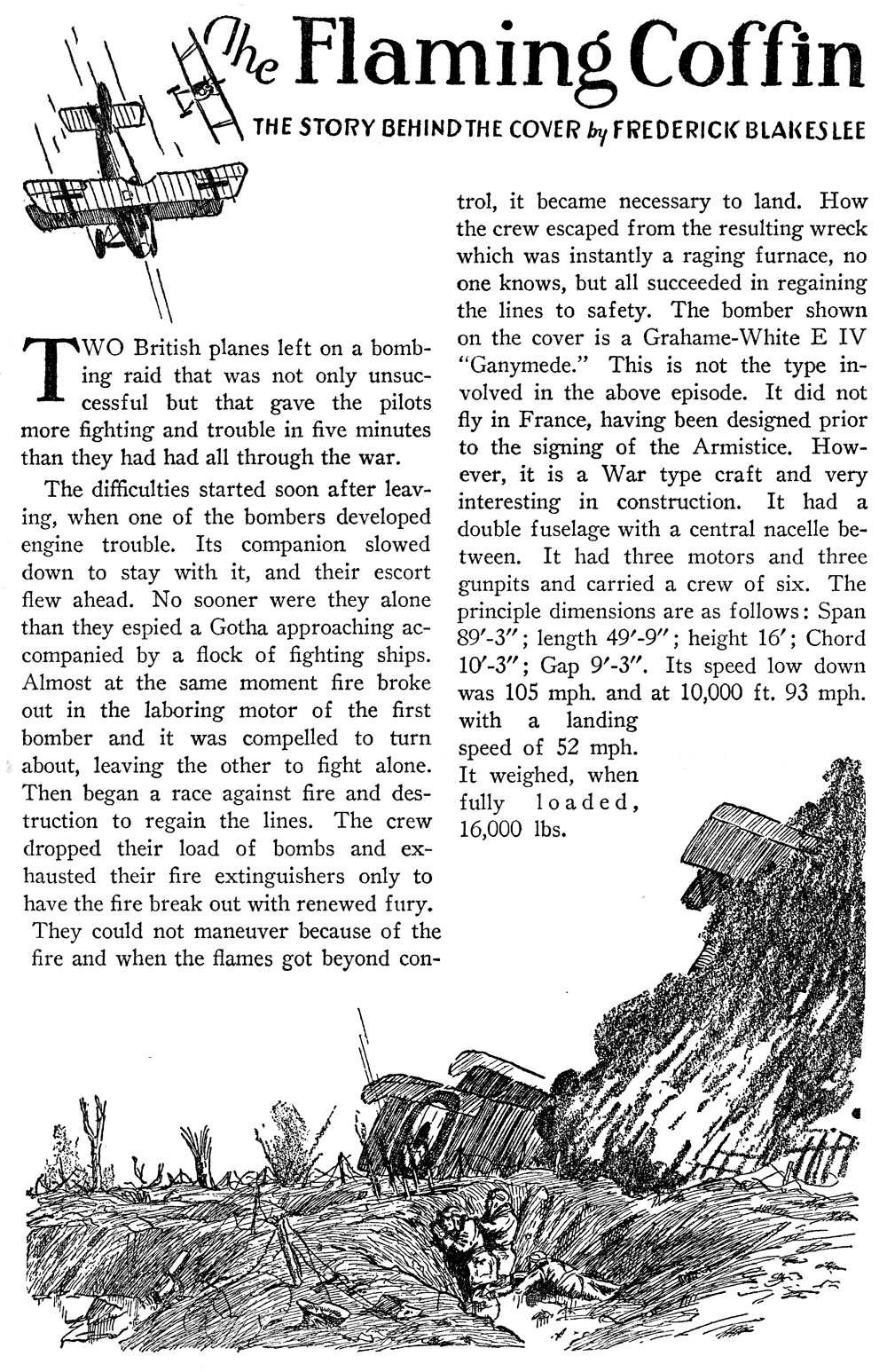 They could not maneuver because of the fire and when the flames got beyond control, it became necessary to land. How the crew escaped from the resulting wreck which was instantly a raging furnace, no one knows, but all succeeded in regaining the lines to safety. The bomber shown on the cover is a Grahame-White E IV “Ganymede.” This is not the type involved in the above episode. It did not fly in France, having been designed prior to the signing of the Armistice. However, it is a War type craft and very interesting in construction. It had a double fuselage with a central nacelle between. It had three motors and three gunpits and carried a crew of six. The principle dimensions are as follows: Span 89′-3″; length 49′-9″; height 16′; Chord 10′-3″; Gap 9′-3″. Its speed low down was 105 mph. and at 10,000 ft. 93 mph. with a landing speed of 52 mph. It weighed, when fully loaded, 16,000 lbs.