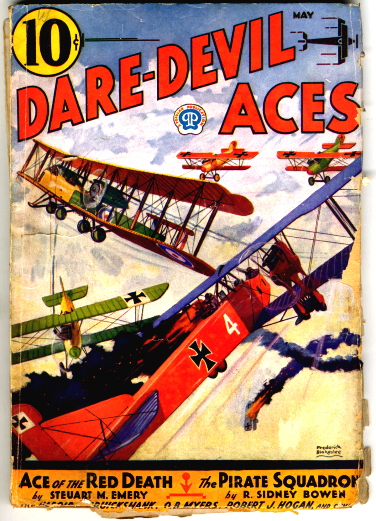 • 2 The painting is the August 1933 cover of Dare-Devil Aces by Frederick Blakeslee. Incidentally, the G-8 pulp on the desk is “Death is My Destiny” (August 1941).