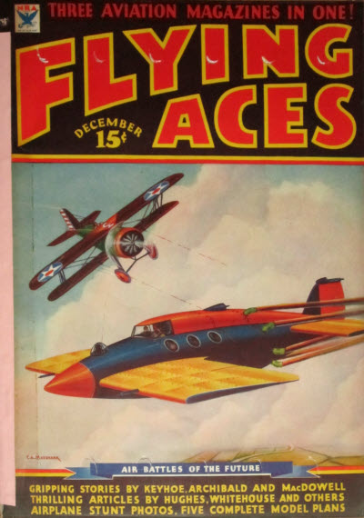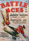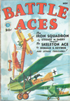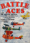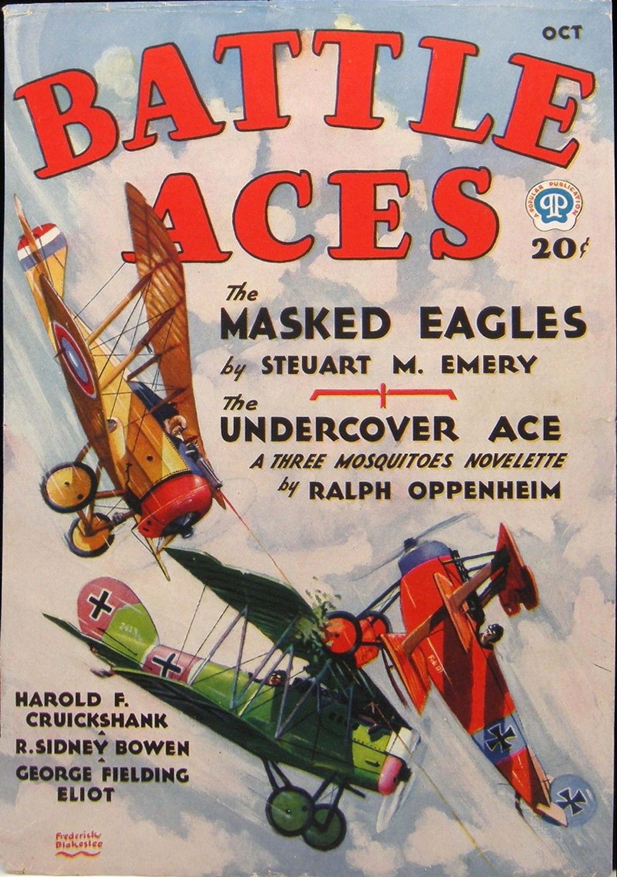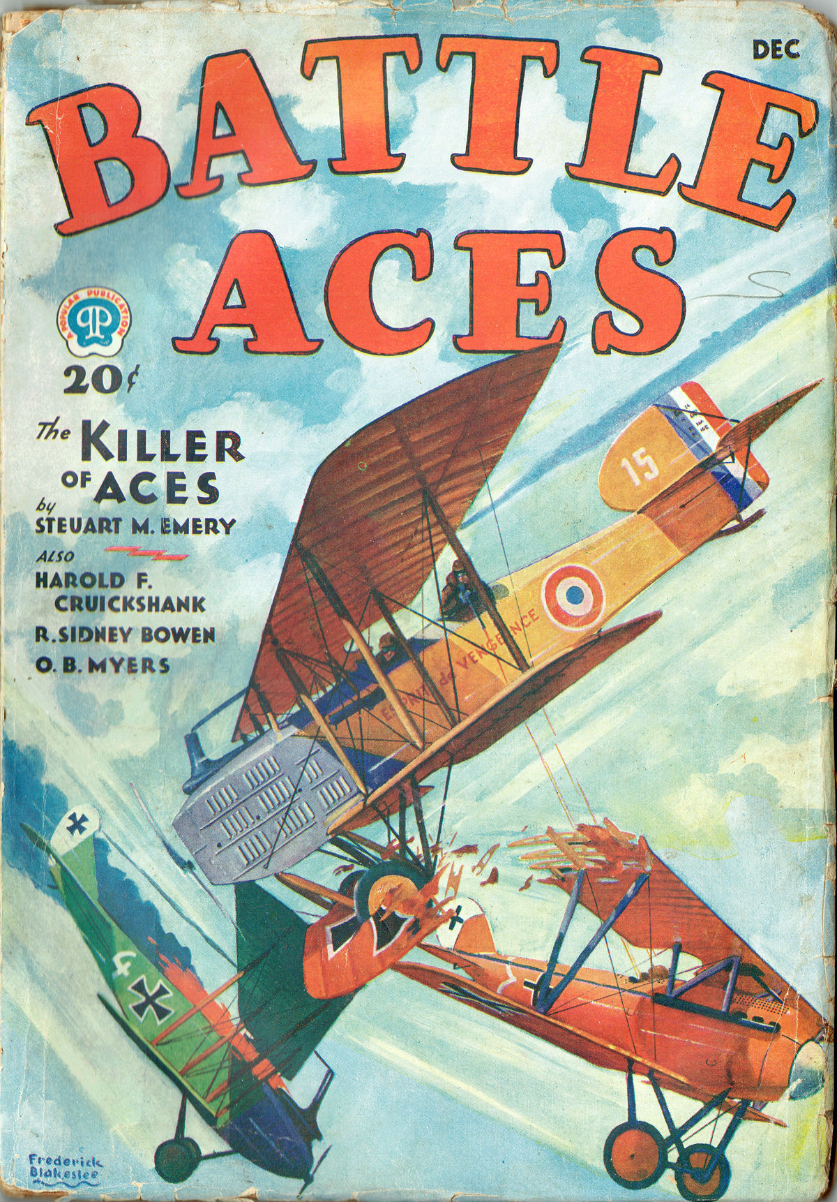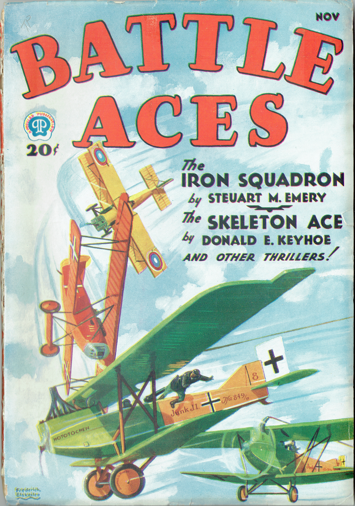 Editor’s Note: This month’s cover is the nineteenth of the actual war-combat pictures which Mr. Blakeslee, well-known artist and authority on aircraft, is painting exclusively for BATTLE ACES. The series was started to give our readers authentic pictures of war planes in color. It also enabled you to follow famous airmen on many of their amazing adventures and feel the same thrills of battle they felt.