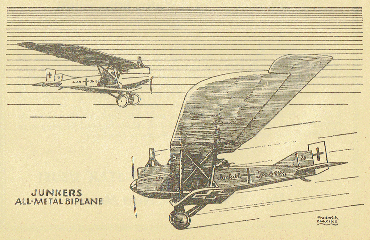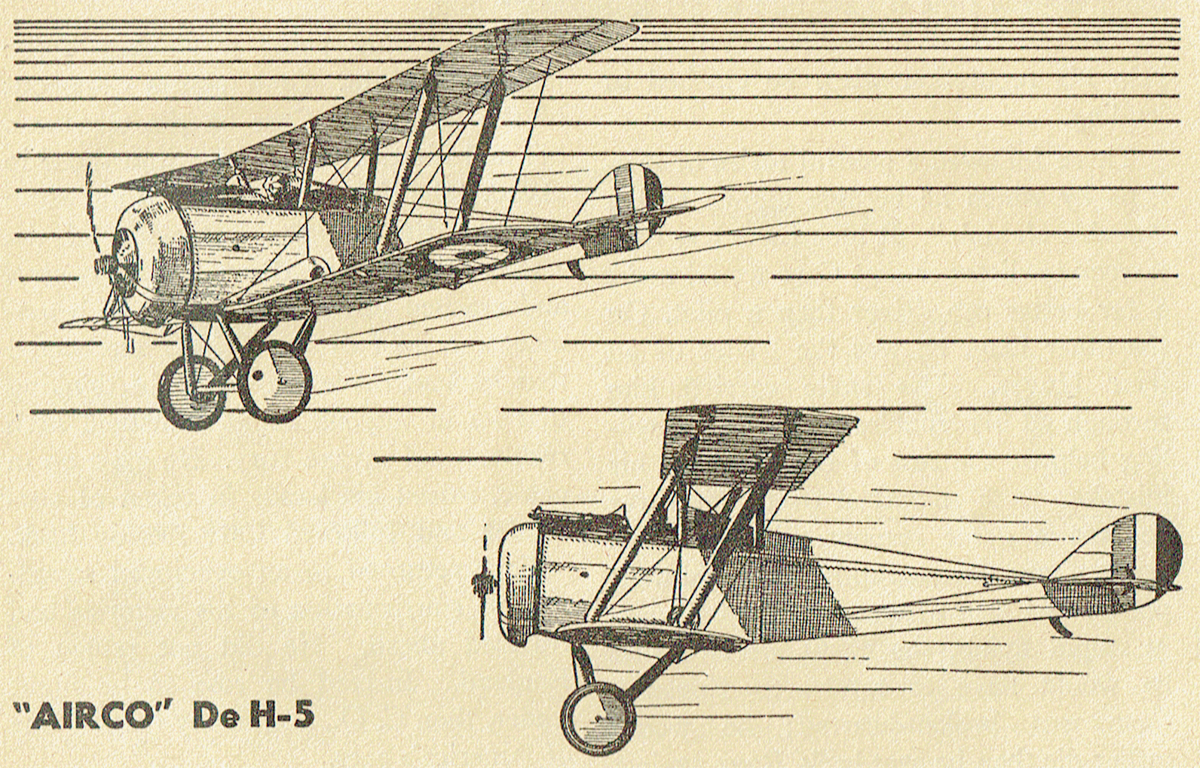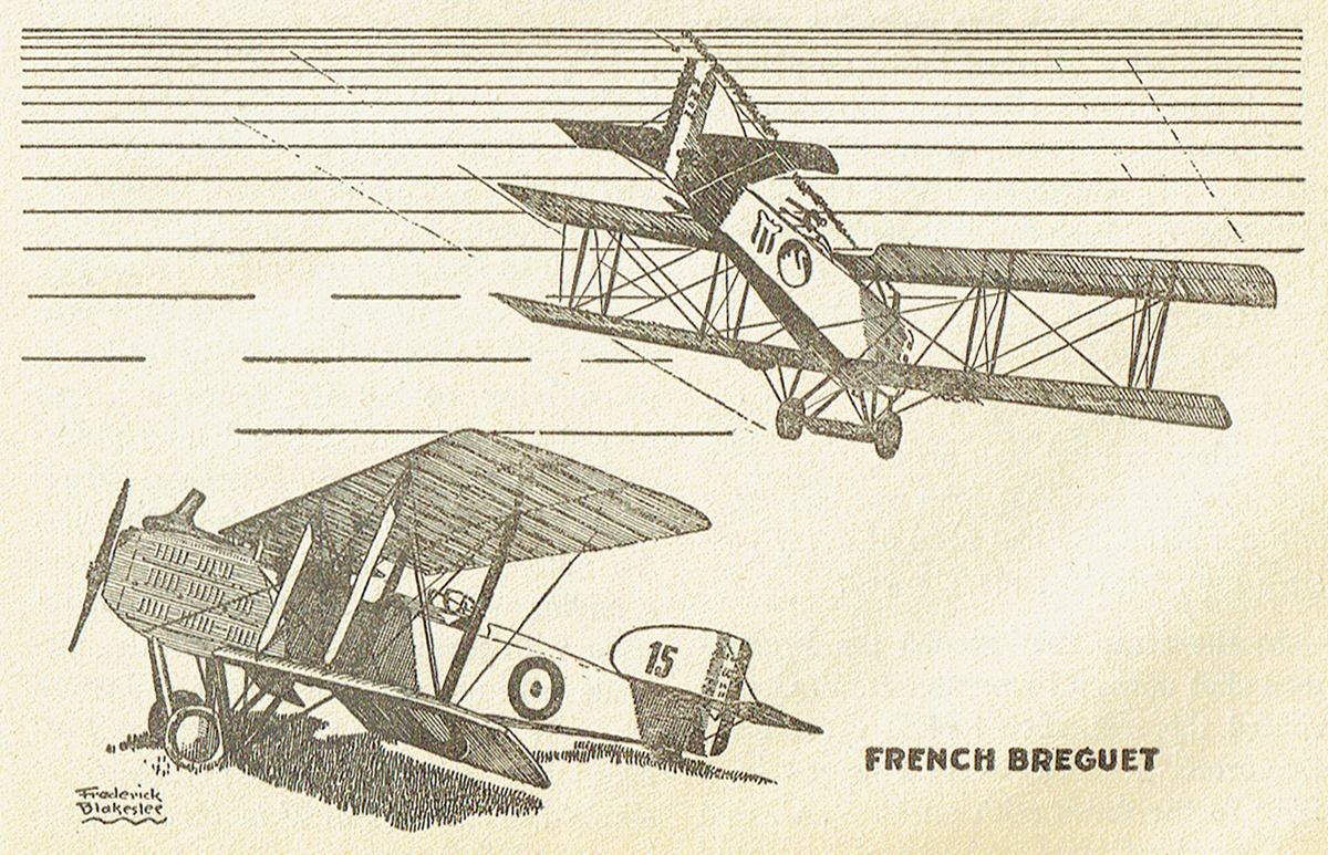 The French ship is a Breguet type 14B-2 with a 300 h.p. Renault engine. It was designed as a day bomber, but carried one gun in front (synchronized) and two guns aft. Only the upper planes were provided with ailerons. The part of the lower plane lying behind the rear spar was hinged along its total length and pulled downward by means of twelve rubber cords fixed on the under side of the ribs. An automatic change of aerofoil corresponding with the load and speed thus results with an easier control of the airplane with and without a load of bombs. Its span was 14.364 meters; length 9 m; speed low down 185 kms per hour. It climbed to 5,000 m. in 47 m. 30 sec. Ceiling was 5,750 m.
