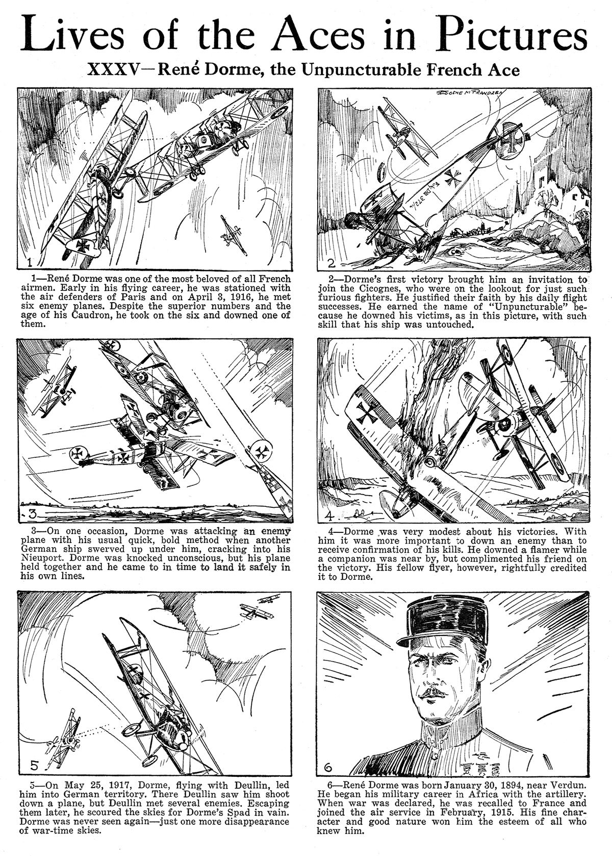 One day early in 1918, the brothers were returning from a mission with two other bombers when they sighted a group of enemy ships escorted by battle planes. Charles examined the flight through his field glasses, as usual; then suddenly he dropped the binoculars, spoke rapidly to his brother. Much to the astonishment of their fellow flyers, Jean’s plane turned and with throttle wide open, hurtled straight for the enemy.