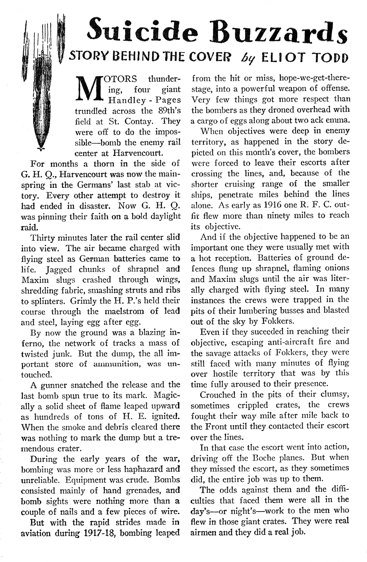 THE Bristol Fighters on this month’s cover have dropped the last of their light demolition bombs on the blazing ammunition dump below and are now battling their way through a cordon of avenging Fokker D-VII’s. Will they make the lines? Well, the Bristol Fighter was so good that it was used right up to the close of the war with very few changes and could be trusted to give a good account of itself in any show.