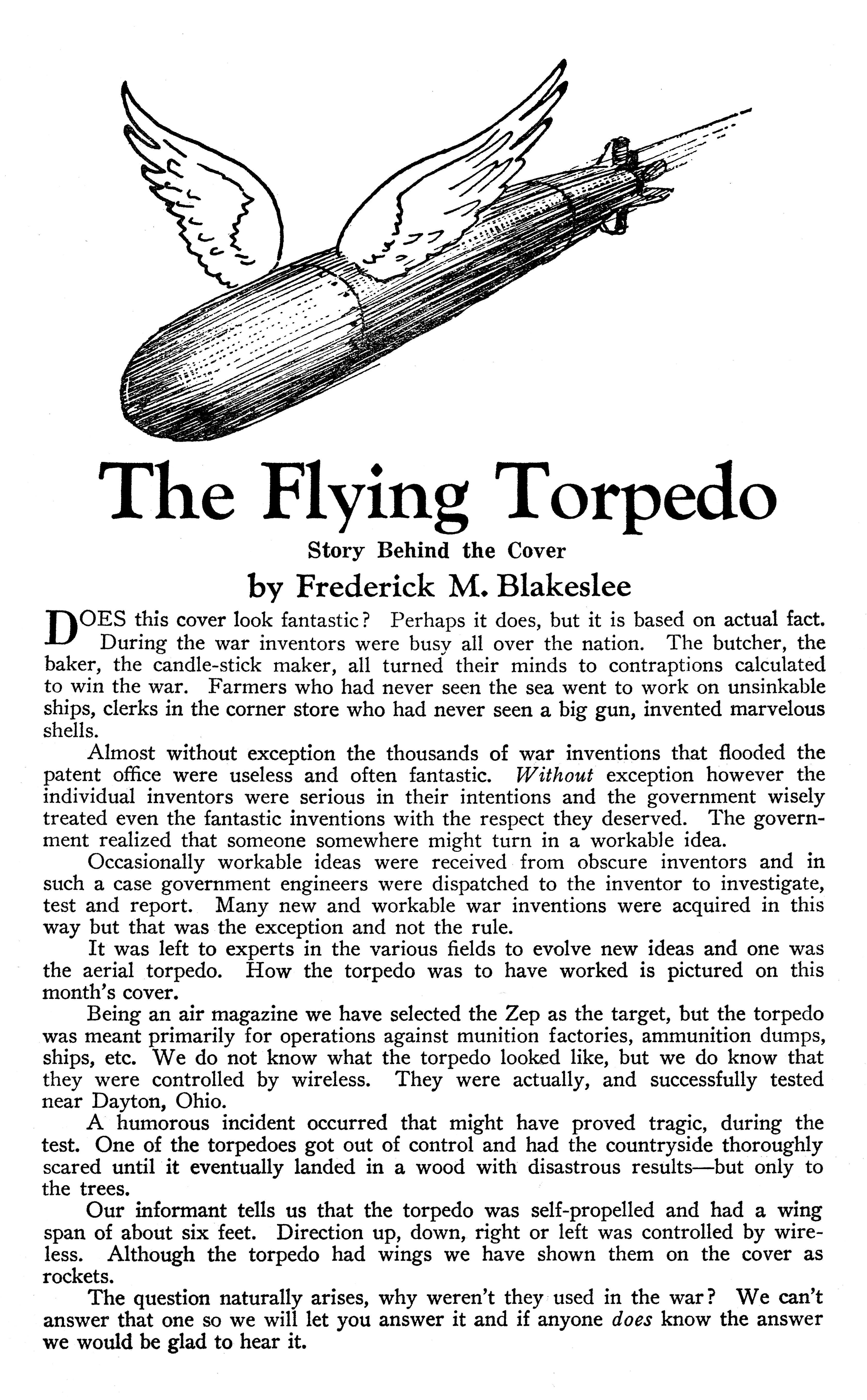 Being an air magazine we have selected the Zep as the target, but the torpedo was meant primarily for operations against munition factories, ammunition dumps, ships, etc. We do not know what the torpedo looked like, but we do know that they were controlled by wireless. They were actually, and successfully tested near Dayton, Ohio.
