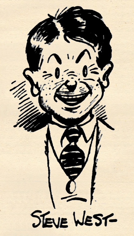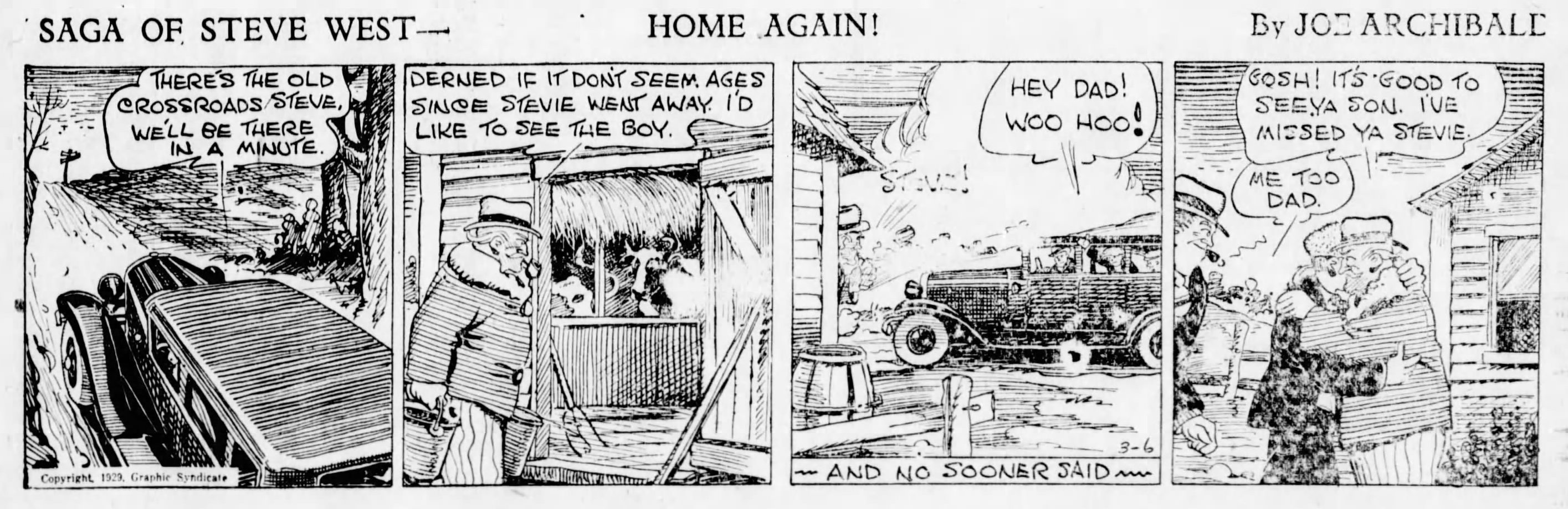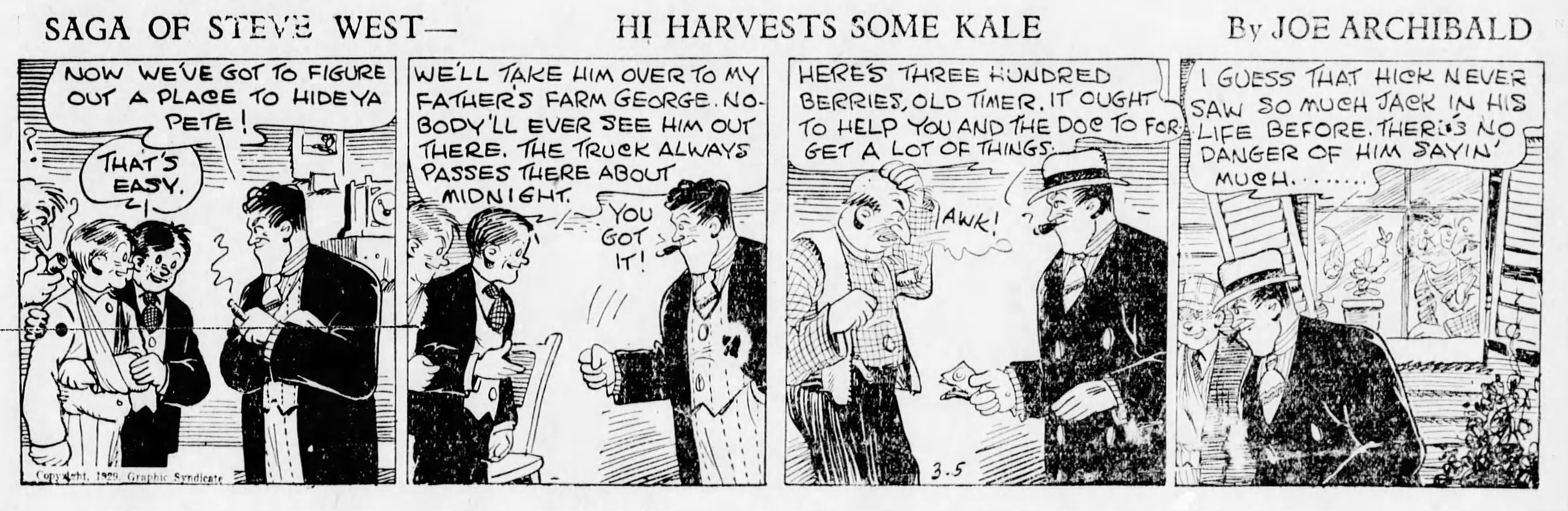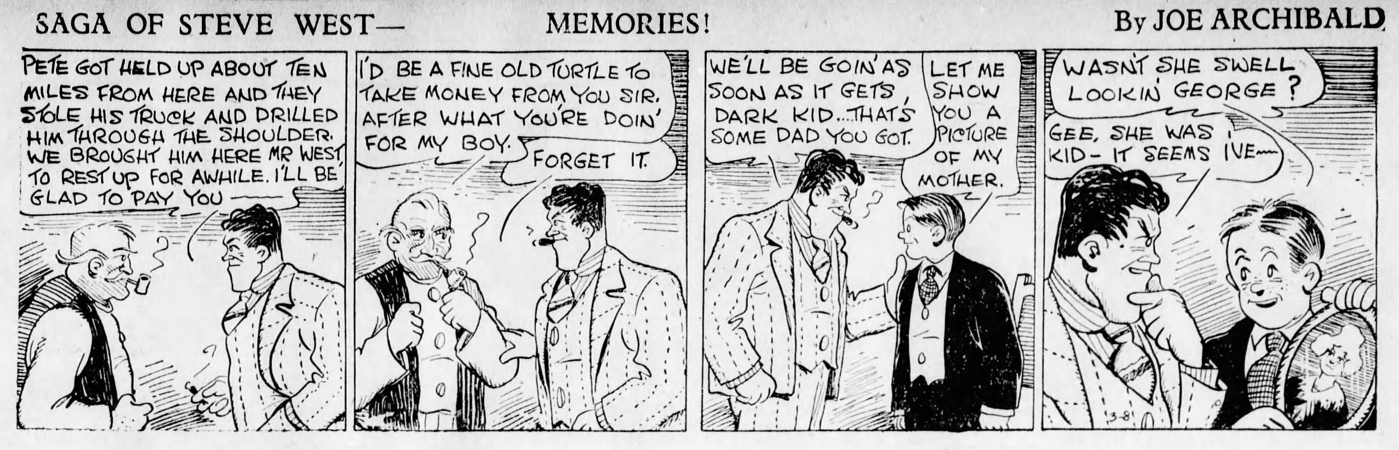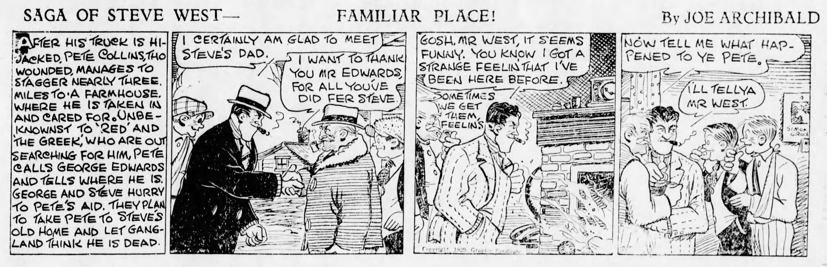 he created his first comic strip syndicated by the New York Evening Graphic. Here he had characters, continuity and action. What he came up with was “Saga of Steve West,” a strip about a young man who leaves the farm and heads to the big city to find his way in life. The principle characters are: Steve West, the young man in question who appears to be in his late teens or early twenties; George Edwards who is Steve’s friend and benefactor and—a bootlegger; Edwards’ secretary and sometimes girlfriend, Helen Wyatt, who has a secret warm spot in her heart for Steve; Detective Gaffney who has matched wits with Edwards in gangland; and rounding out the main cast is Steve’s pal Pete Collins.