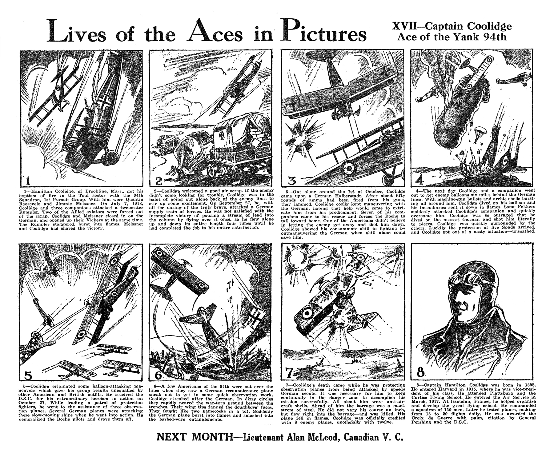 Starting in the May 1932 issue of Flying Aces and running almost 4 years, Eugene Frandzen’s “Lives of the Aces in Pictures” was a staple of the magazine. Each month Frandzen would feature a different Ace that rose to fame during the Great War. This time around we American Ace—Capitain Hamilton Coolidge!