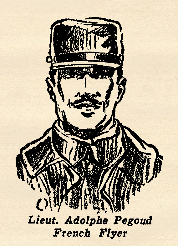 With Pourpe, Garros, Vedrines, and several others, he made up the first French air squadron to see action in the World War. In those days planes, frail contraptions of wood, linen and wires, were not armed. The pilots usually carried a rifle or shotgun when going aloft, and sometimes darts and hand grenades. Plane to plane fighting was unknown. The crafts were used for scouting. Pegoud changed all this when ho initiated the first air battle. He tells about it in the account below.