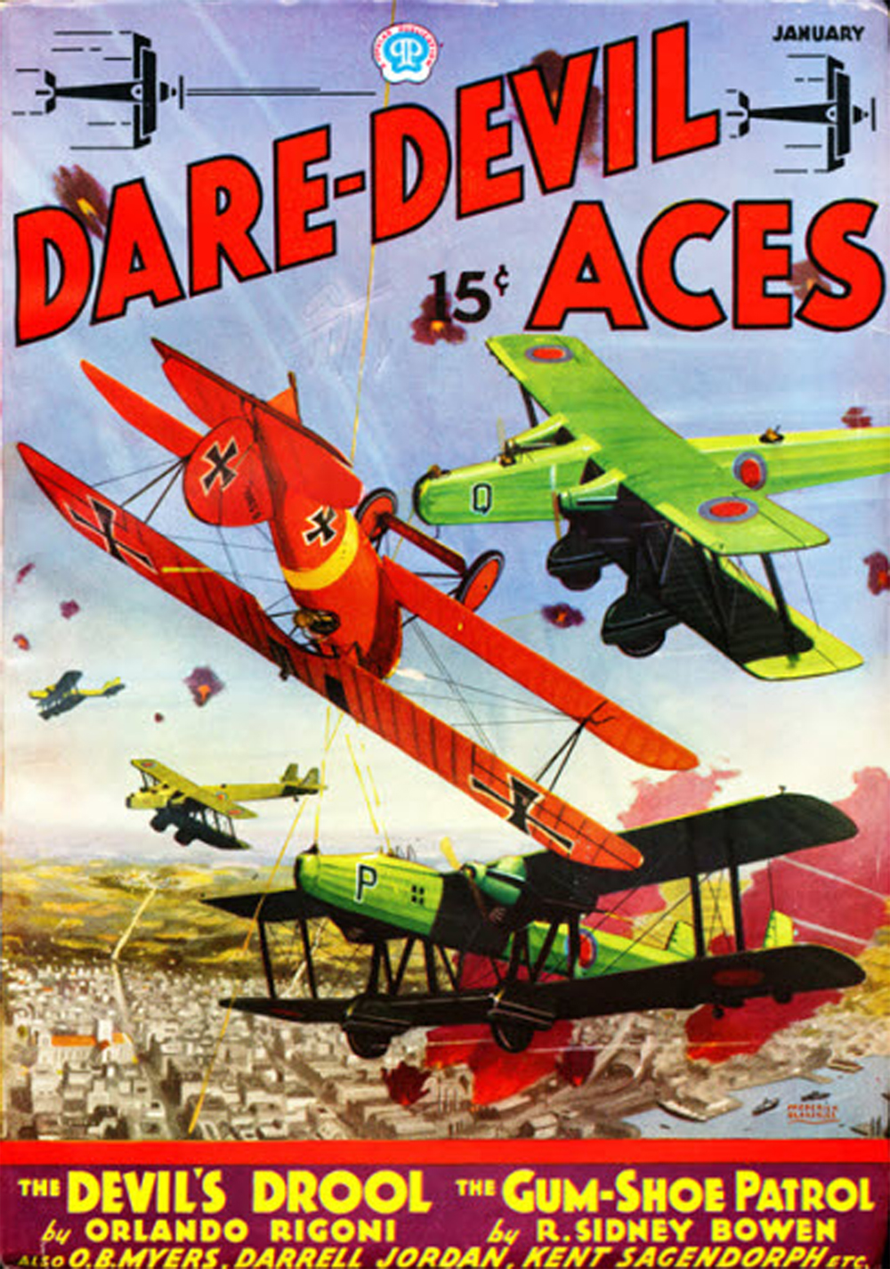 LESTER DENT is best remembered as the man behind Doc Savage. But he wrote all number of other stories before he started chronicling the adventures of everyone’s favorite bronze giant. Here we have an action-packed tale of the air—The Boche have developed an even faster and better plane and Major Sam Flack has been called in to double bluff a captured Boche agent into taking him behind enemy lines to the prototype!