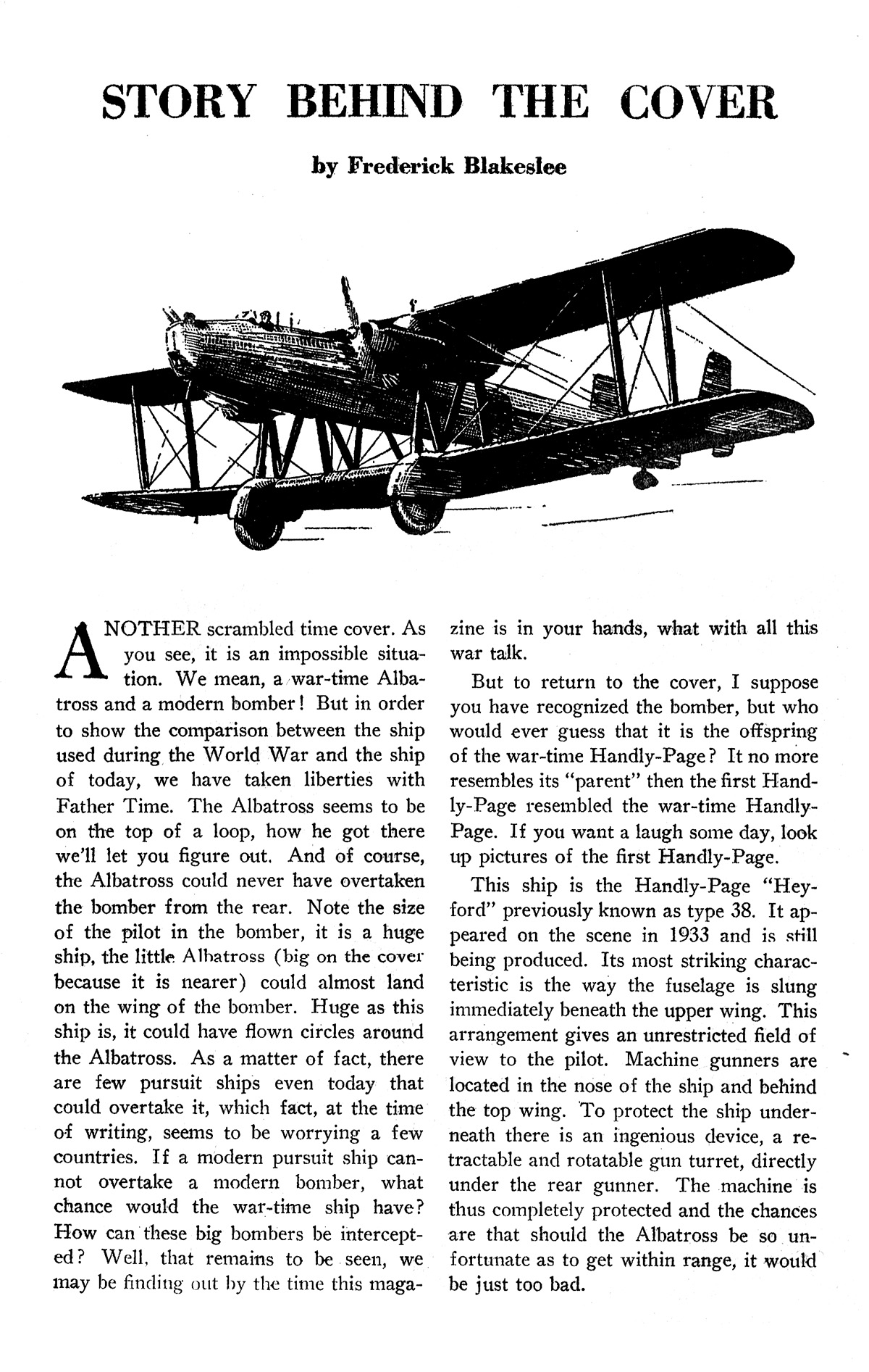 th_DDA_3601ANOTHER scrambled time cover. As you see, it is an impossible situation. We mean, a war-time Albatross and a modern bomber! But in order to show the comparison between the ship used during the World War and the ship of today, we have taken liberties with Father Time. The Albatross seems to be on the top of a loop, how he got there we’ll let you figure out. And of course, the Albatross could never have overtaken the bomber from the rear. Note the size of the pilot in the bomber, it is a huge ship, the little Albatross (big on the cover because it is nearer) could almost land on the wing of the bomber. Huge as this ship is, it could have flown circles around the Albatross. As a matter of fact, there are few pursuit ships even today that could overtake it, which fact, at the time of writing, seems to be worrying a few countries. If a modem pursuit ship cannot overtake a modern bomber, what chance would the war-time ship have? How can these big bombers be intercepted? Well, that remains to be seen, we may be finding out by the time this magazine is in your hands, what with all this war talk.