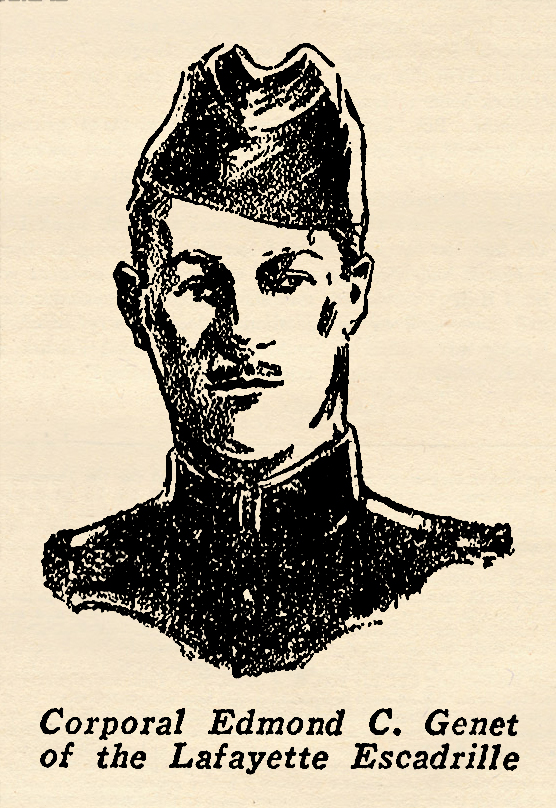 Citizen Genet, who served as the revolutionary ambassador from France during George Washington’s term as president, Edmond C. Genet had a distinguished heritage. Mild-mannered and handsome he was a typical soldier of fortune at heart, possessing an astonishing courage. At 10 he missed an appointment to Annapolis and immediately enlisted in the navy where he participated in the taking of Vera Cruz. A year later he was in battle in Haiti. Later on after the war in Europe broke out, he sailed for France to enlist in the Foreign Legion. He served for some years in the trenches as a simple poilu, then was transferred to aviation and assigned to Escadrille N-124, better known as the Lafayette, where he was the youngest American in a company of famous men. Genet’s flying time on the front was short. He was one of the few airplane pilots to be killed in the air by enemy shrapnel. He was the first American to die in action under the stars and stripes, his death occurring just ten days after America entered the war. The account below is from one of his letters home.
