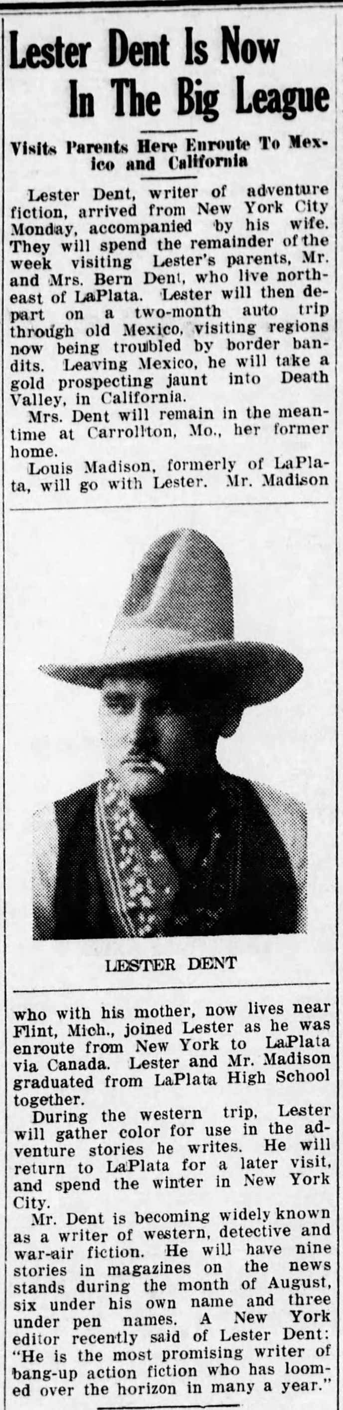 Lester Dent, writer of adventure fiction, arrived from New York City Monday, accompanied by his wife. They will spend the remainder of the week visiting Lester’s parents, Mr. and Mrs. Bern Dent, who live northeast of LaPlata. Lester will then depart on a two-month auto trip through old Mexico, visiting regions now being troubled by border bandits, leaving Mexico, he will take a gold prospecting jaunt into Death Valley, in California.