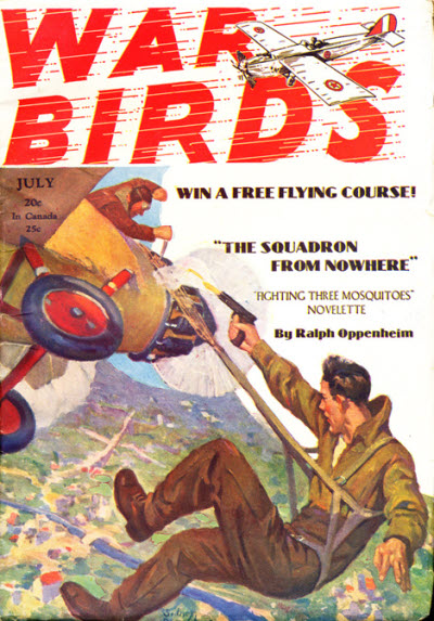 TO ROUND off Mosquito Month we have a non-Mosquitoes story from the pen of Ralph Oppenheim. It was always his observer, Jim Evans, who judged the dive, who directed Haskell as the latter worked controls, who told Haskell the precise moment to jerk back his stick and pull up—the same moment when Evans would release the bombs. And due to this uncanny judgment of Evans, and also to Haskell’s flying skill and strength, the two had never failed. Oh, they had been a team—Bomber Dan Haskell, big, husky, two-fisted—and Jim Evans, smaller, but lithe and agile and just as ready for action. An inseparable team, Which co-ordinated like a machine—which could do bombing work as no other unit. With Haskell as reckless pilot, and Evans in the rear as gunner and observer—though he wore a pilot’s full two wings—they had fought their way through all odds, dived upon their target hellbent, and blasted it right off the face of the earth. But Jim had been lost the day before on a run leaving Dan to set off on a daring mission alone—He must bomb bridge K-100 to keep the Germans from advancing on the Allied lines! From the June 1934 issue of Sky Fighters it’s “Mission of Death!”