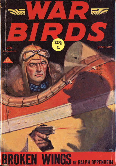 Were back with the third of three Three Mosquitoes stories we’re presenting this month. The Three Mosquitoes disband! The darker side of notoriety rears it’s ugly head—is Kirby a “Glory Grabber” taking all the glory and sharing none of the credit—easily picking off the other’s adversaries out from under them? Does he take Shorty Carn and Lanky Travis for granted? Yes, that inseparable threesome have it out and go their own ways! Each sinking the lowest a man can go without the others—and just as the big German offensive is about to kick off! Can the Kirby, Carn and Travis fix their “Broken Wings” or is this it for the intrepid trio? In what is probably their darkest tale, from the pages of the January 1931 issue of War Birds!
