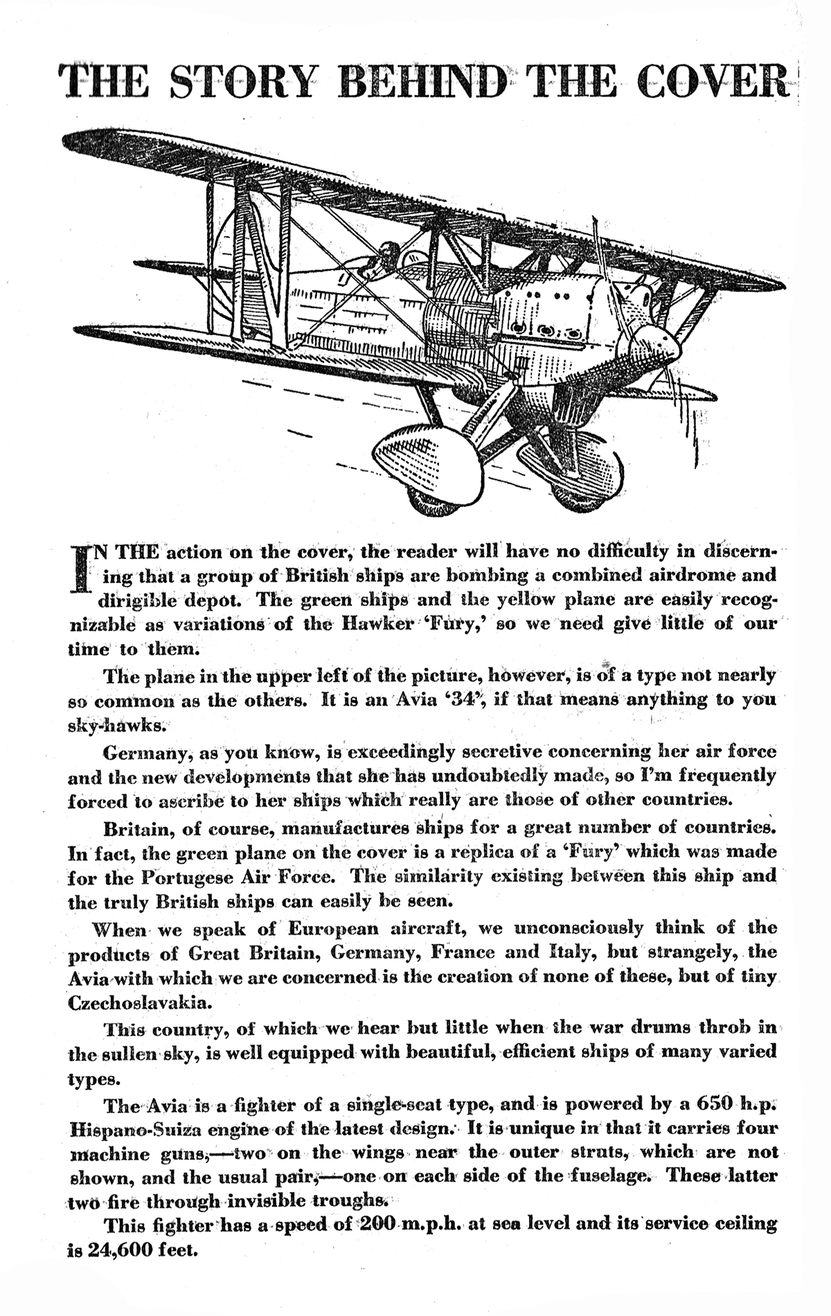 IN THE action on the cover, the reader will have no difficulty in discerning that a group of British ships are bombing a combined airdrome and dirigible depot. The green ships and the yellow plane are easily recognizable as variations of the Hawker ‘Fury,’ so we need give little of our time to them.