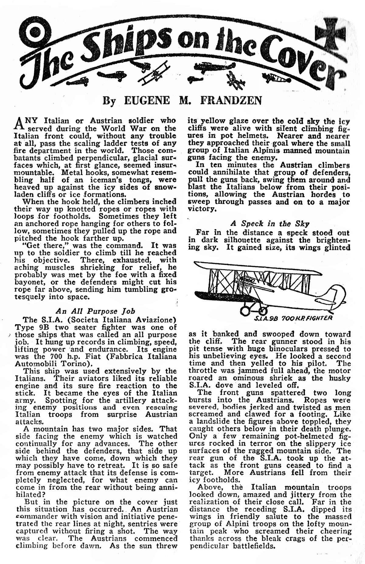 Above, the Italian mountain troops looked down, amazed and jittery from the realization of their close call. Far in the distance the receding S.I.A. dipped its wings in friendly salute to the massed group of Alpini troops on the lofty mountain peak who screamed their cheering thanks across the bleak crags of the perpendicular battlefields.