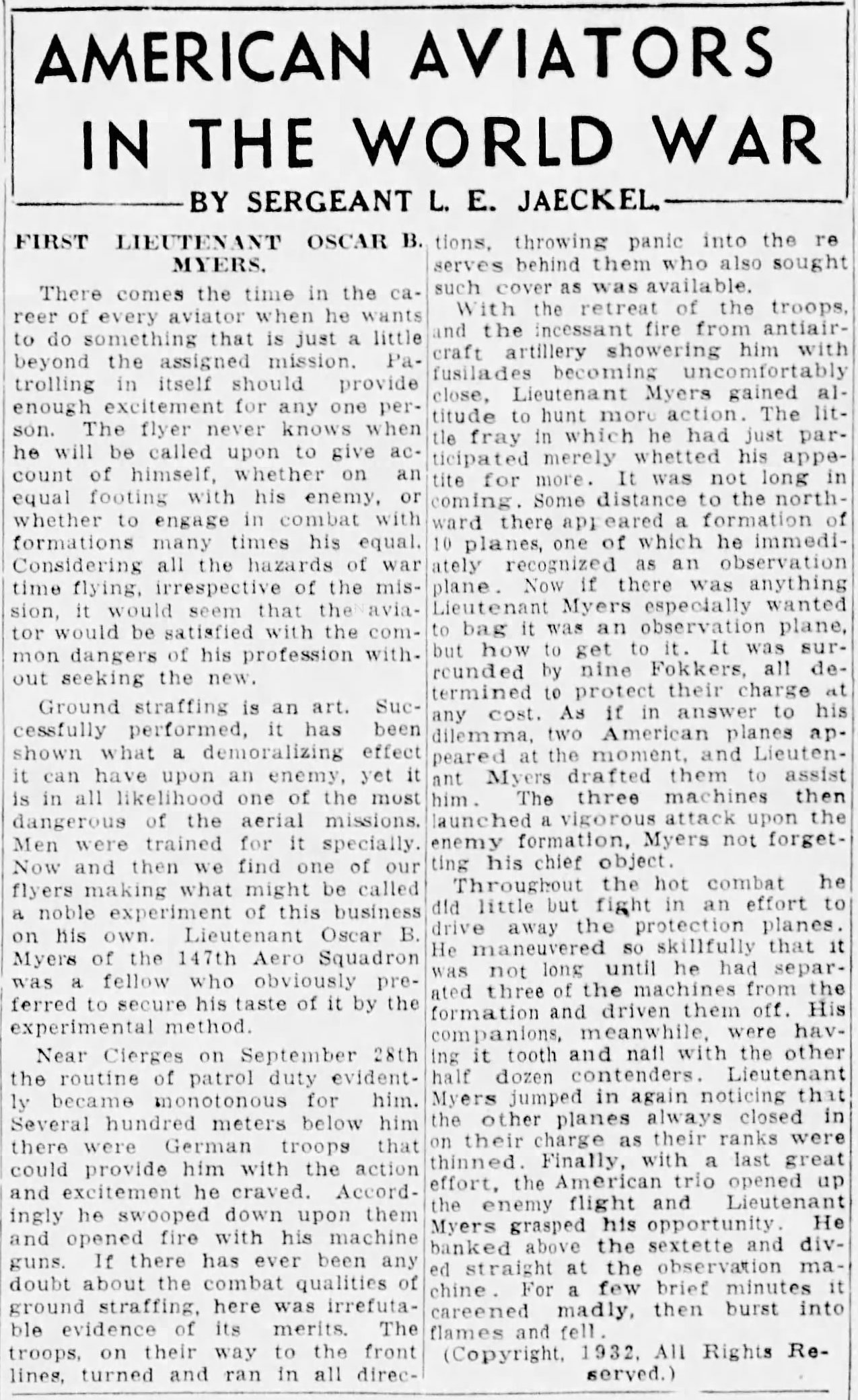 Ground straffing is an art. Successfully performed, it has been shown what a demoralizing effect it can have upon an enemy, yet it is in all likelihood one of the most dangerous of the aerial missions. Men were trained for it specially. Now and then we find one of our flyers making what might be called a noble experiment of this business on his own. Lieutenant Oscar B. Myers of the 147th Aero Squadron was a fellow who obviously preferred to secure his taste of it by the experimental method.