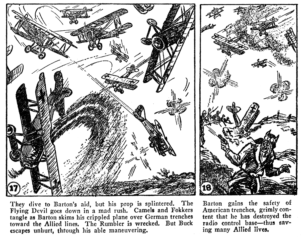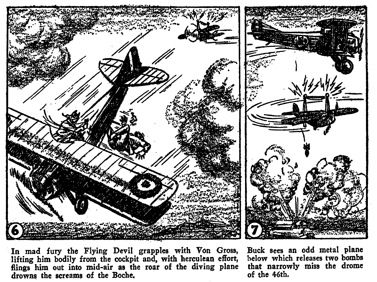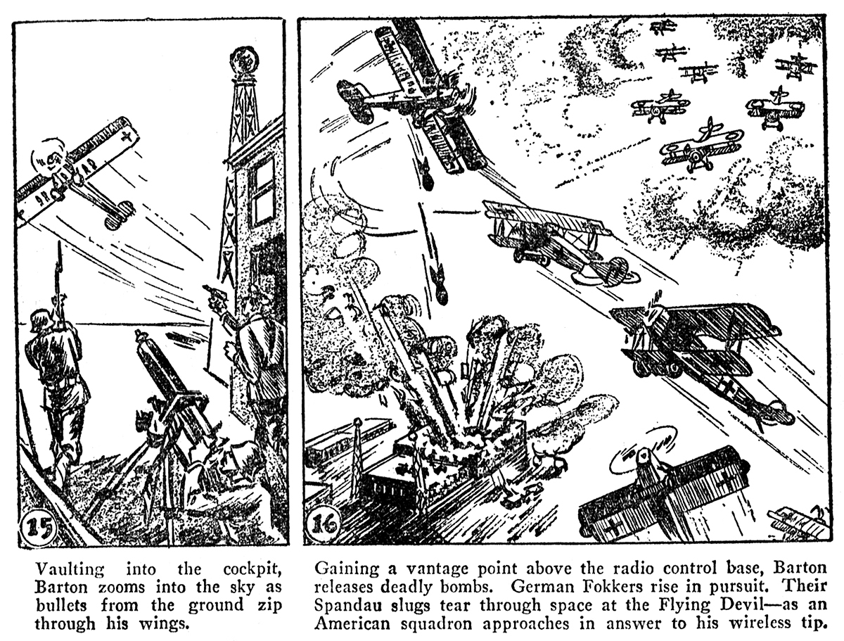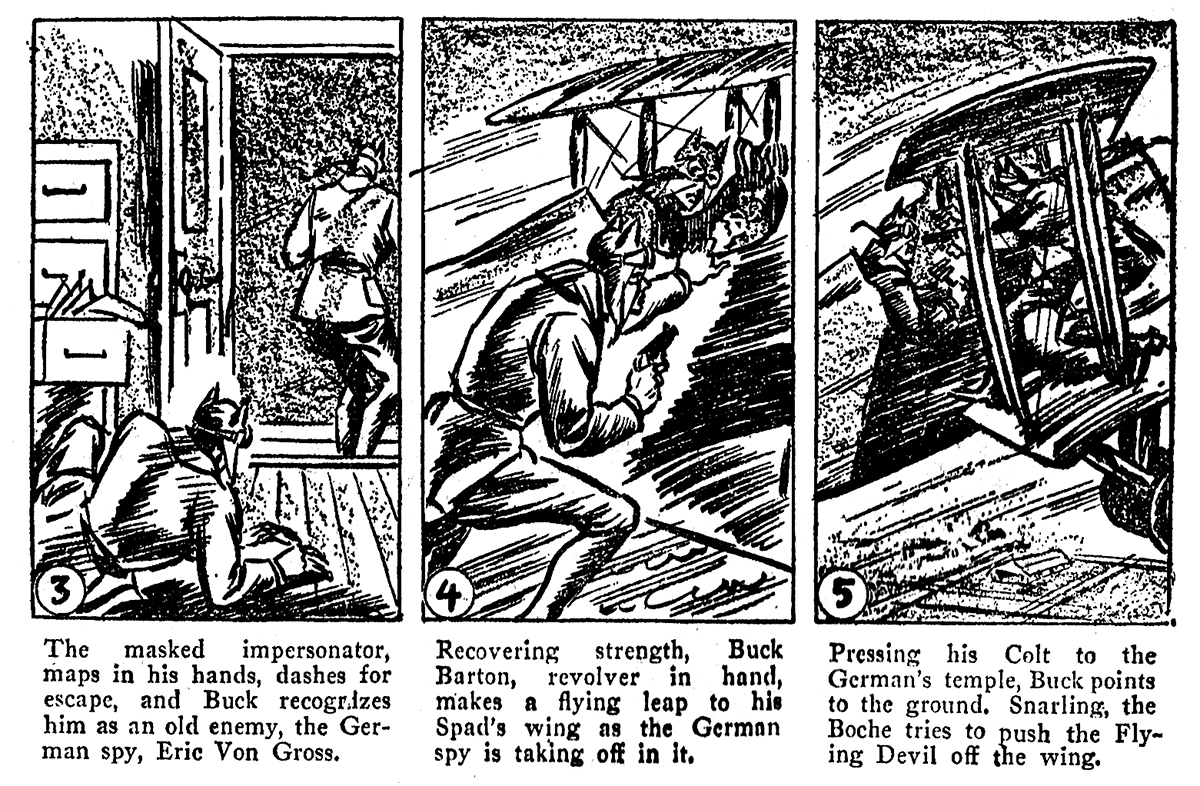 in on The Flying Devil! The Flying Devil was a regular feature of the first fifteen issues of The Lone Eagle and, more importantly, as they announced beneath each month’s story—“the Only War-Air Cartoon Story to Appear in Any Magazine!” The strip was drawn by Terry Gilkison and features the exploits of Buck Barton, a.k.a. The Flying Devil, as he wages a one man war against the Germans in his Spad with the devil on the fuselage.