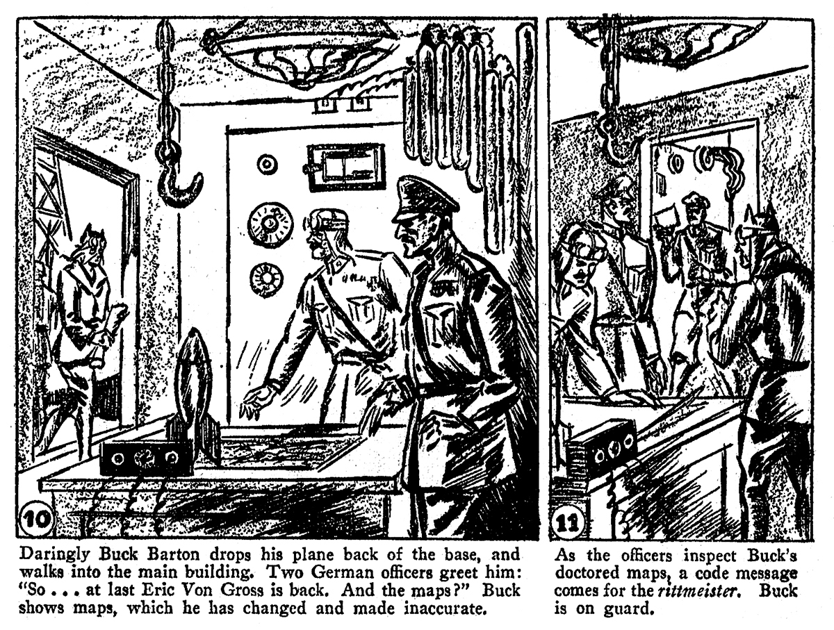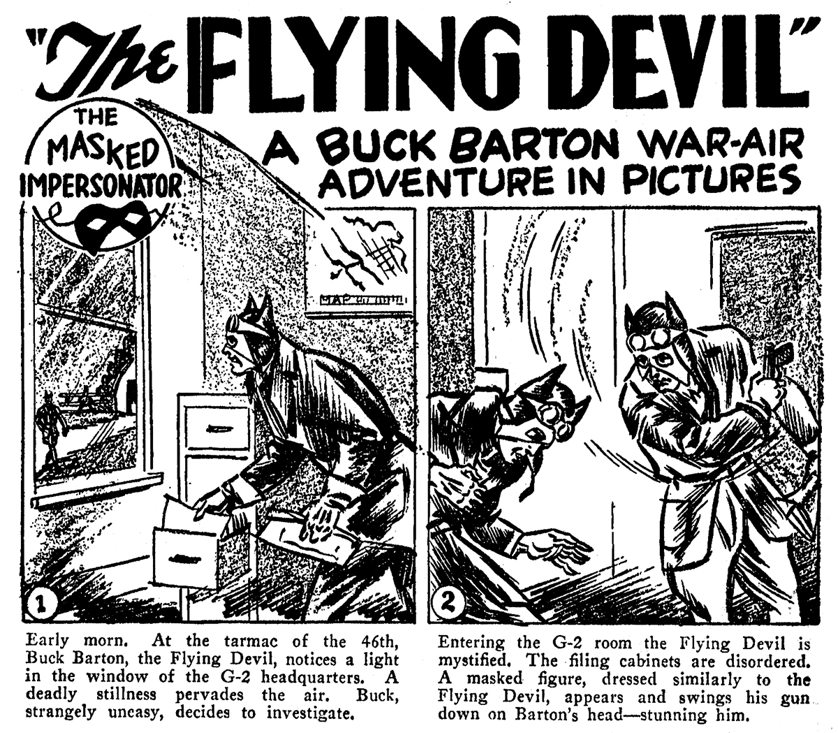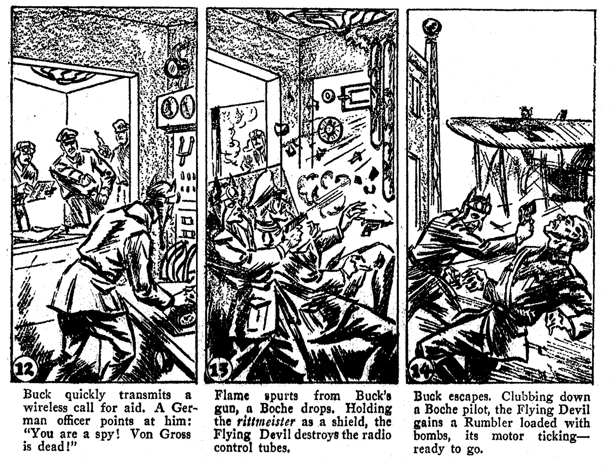 in on The Flying Devil! The Flying Devil was a regular feature of the first fifteen issues of The Lone Eagle and, more importantly, as they announced beneath each month’s story—“the Only War-Air Cartoon Story to Appear in Any Magazine!” The strip was drawn by Terry Gilkison and features the exploits of Buck Barton, a.k.a. The Flying Devil, as he wages a one man war against the Germans in his Spad with the devil on the fuselage.