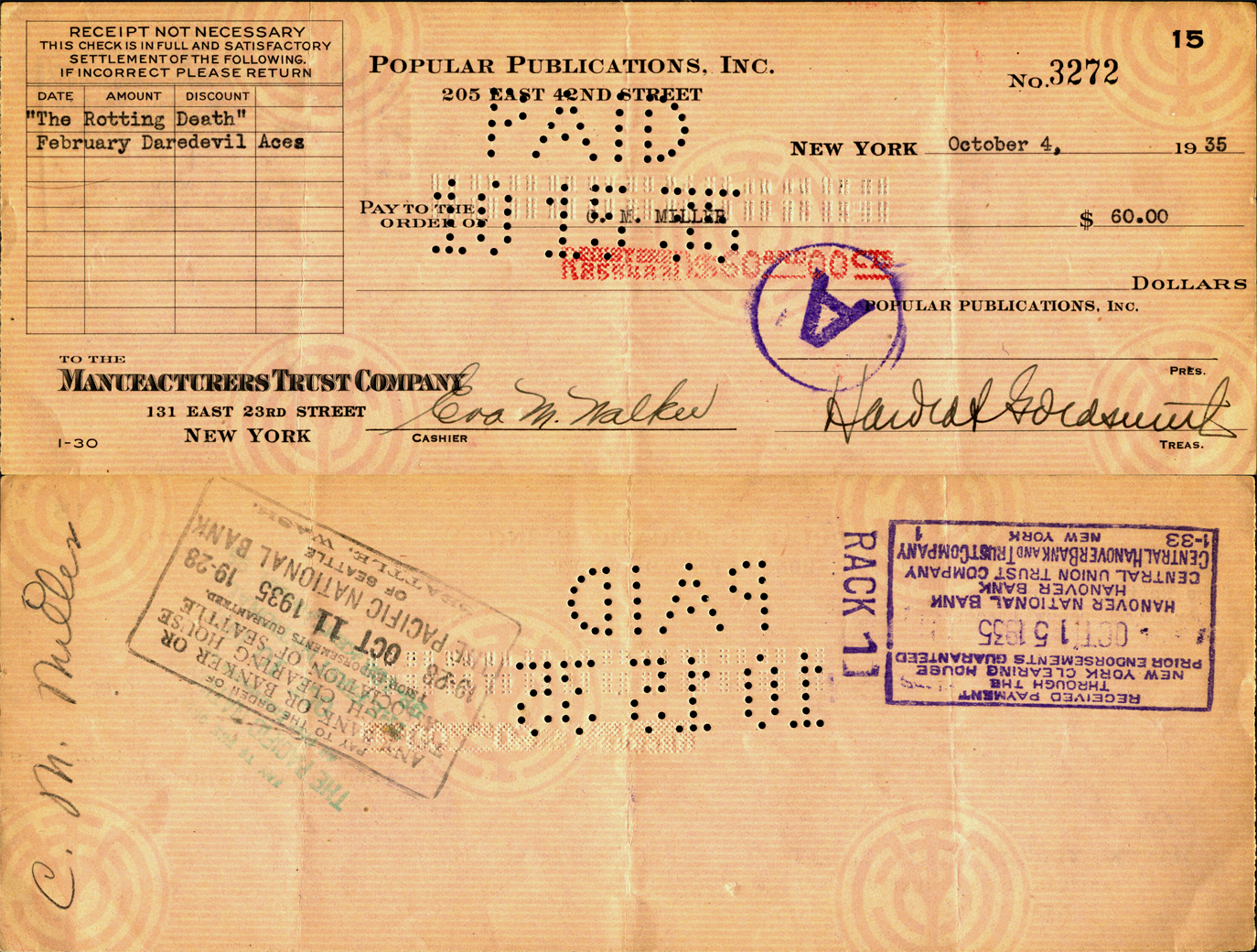 C. M. Miller’s life is something of a mystery. In trying to research the man behind the prolific byline, the only solid fact we have uncovered is that his name is not a pseudonym. We know this because we have a check he received in payment for the Chinese Brady story “The Rotting Death” (Dare-Devil Aces, February 1936) cashed in Seattle in October 1935 in his own name, bearing his signature.