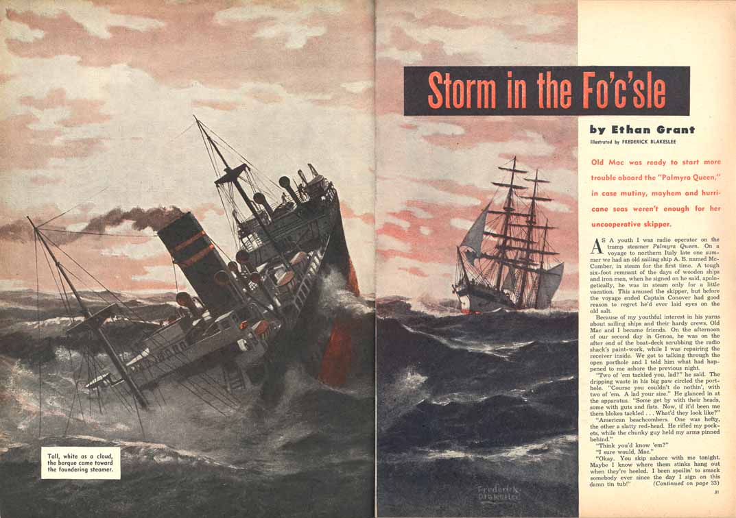 The June 1951 issue of Railroad Magazine was the last pulp published with a Blakeslee cover. Harry Steeger followed the public, whose reading habits were moving away from the pulps and toward the men’s adventure magazines, of which Argosy became his best seller. Blakeslee received occasional assignments for that magazine, but he was no longer able to depend on a steady income from Popular Publications. Through his connections with other artists, Blakeslee received a few freelance assignments for American Weekly Magazine. Although these jobs paid better than the pulps, there were only sporadic assignments and Blakeslee needed more income.