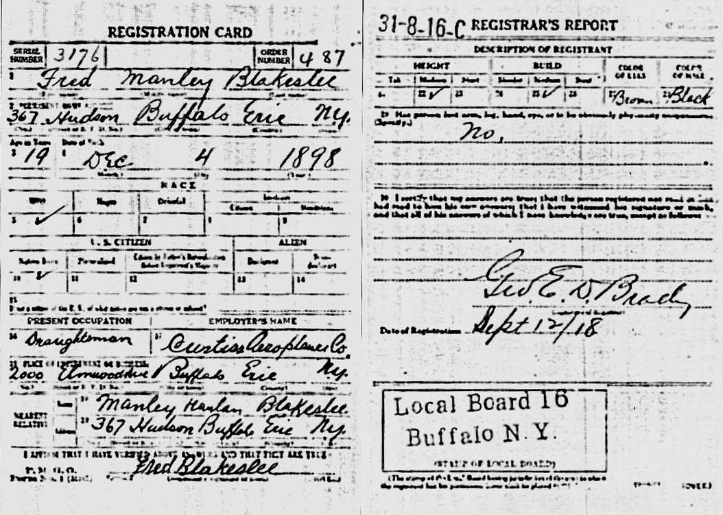 The first day that Frederick Blakeslee was eligible for the mandatory National draft registration was on September 12, 1918. He reported to his local board for registration and a physical exam and he was accepted for induction in the Army. As fate would have it, the war ended just two months later and the young draftsman was never mobilized