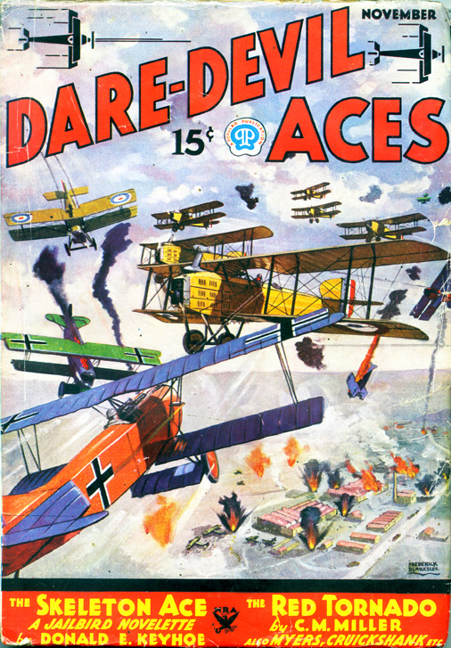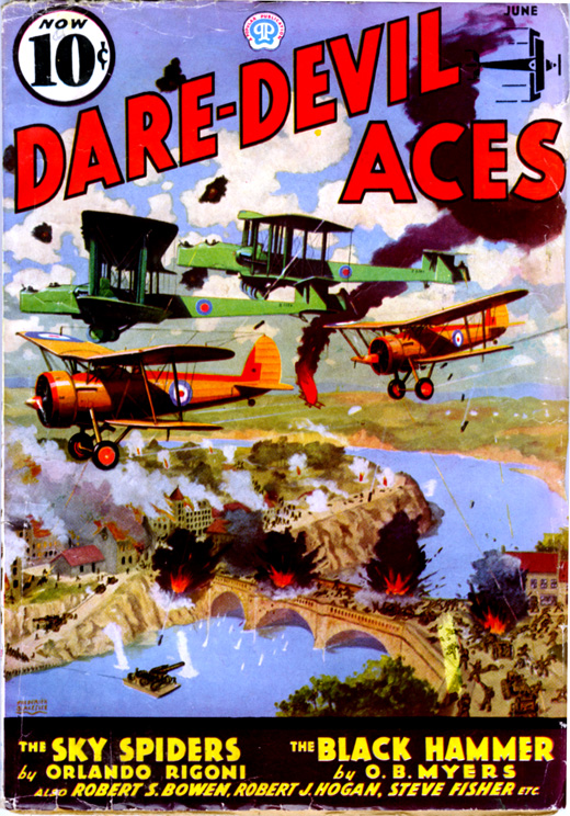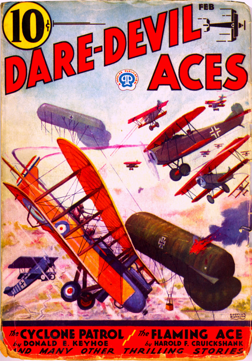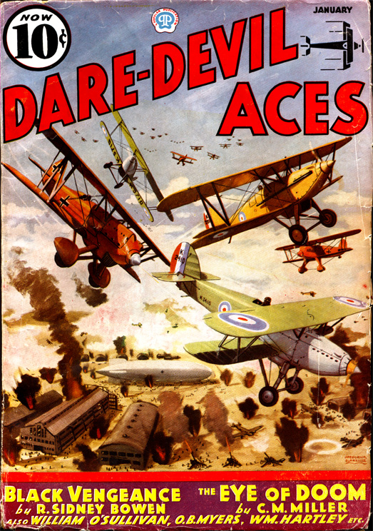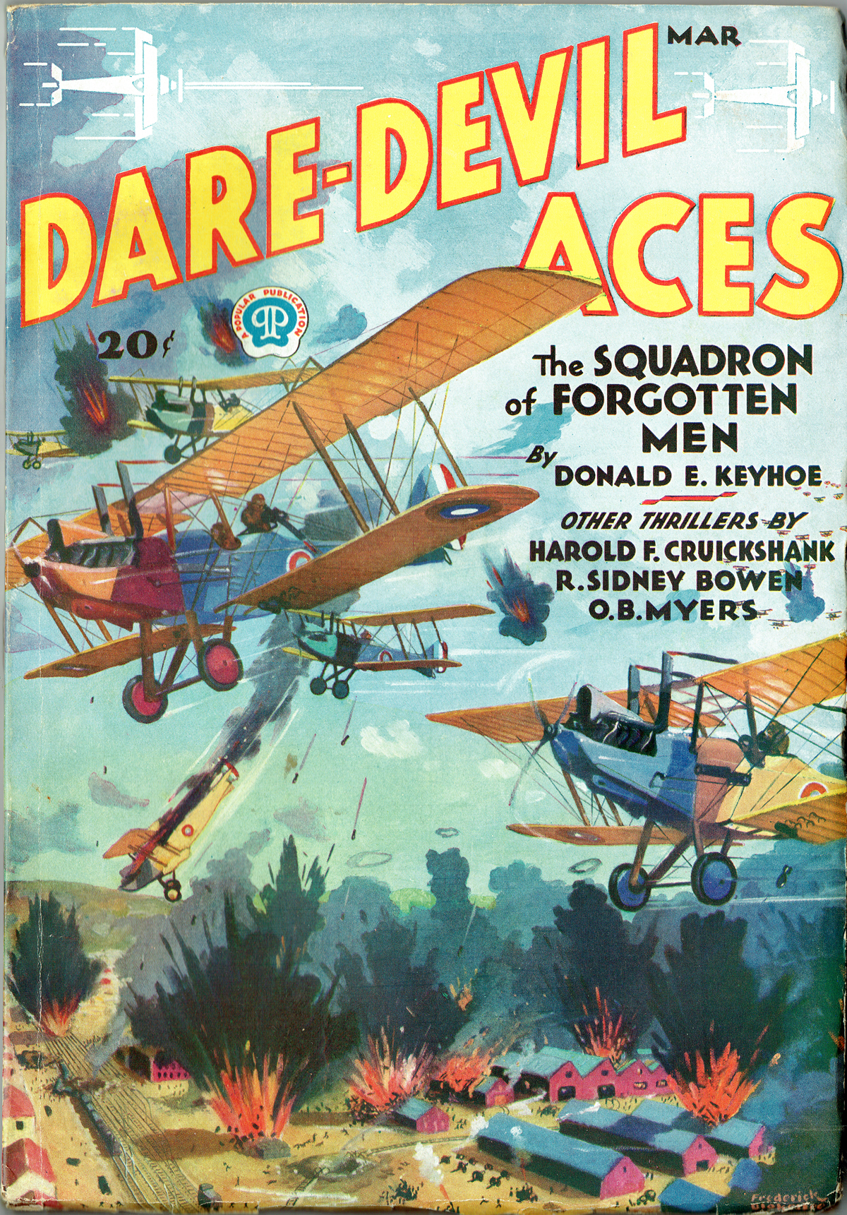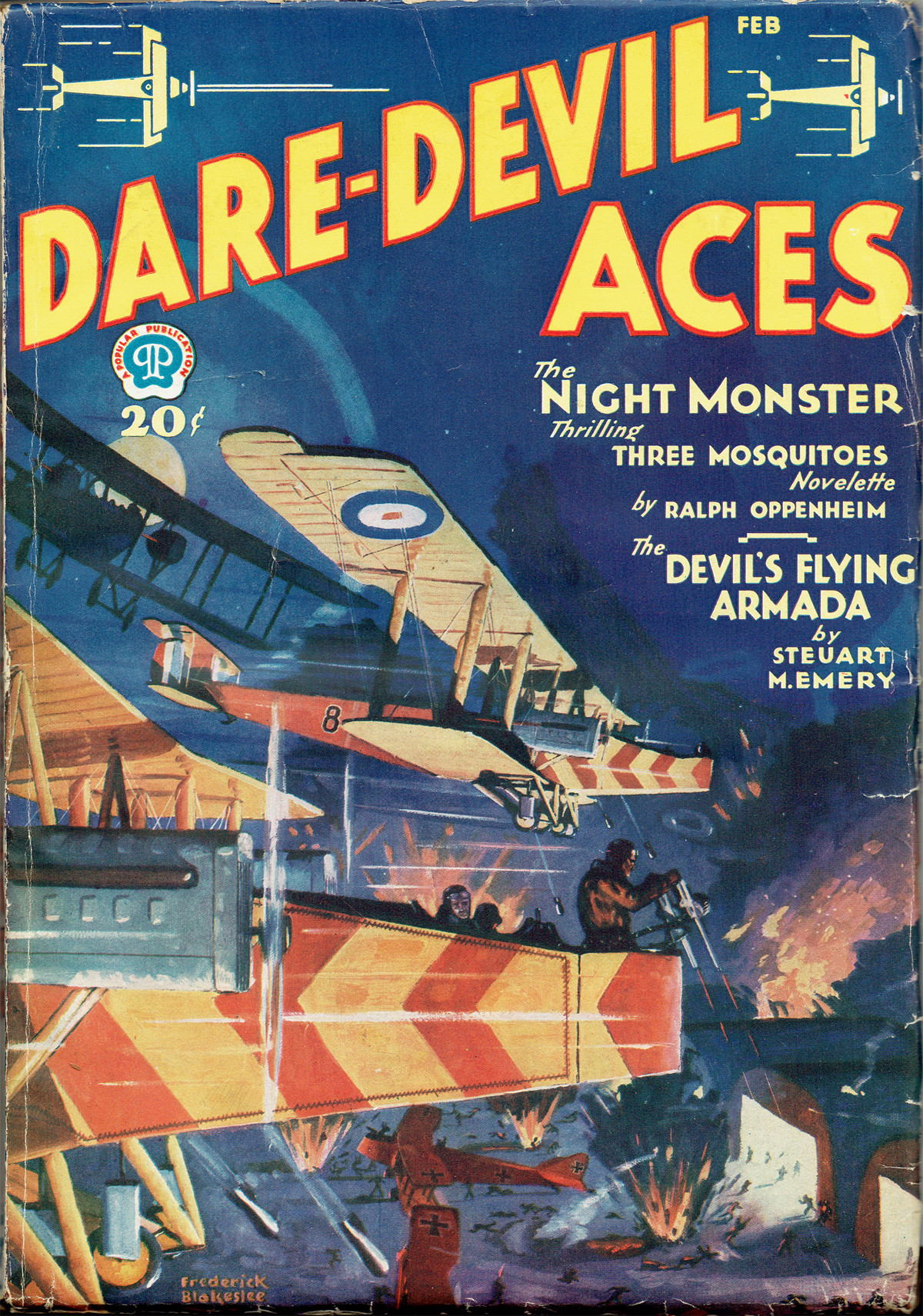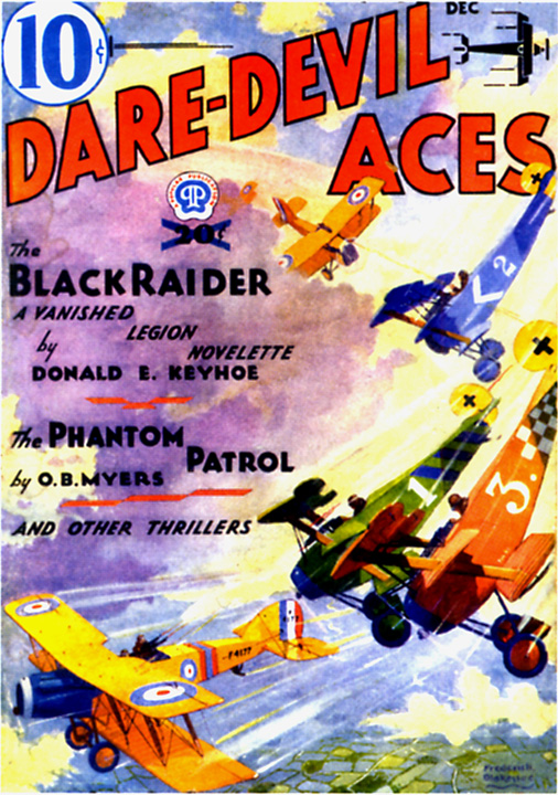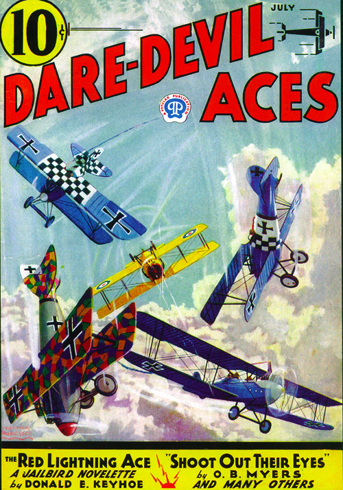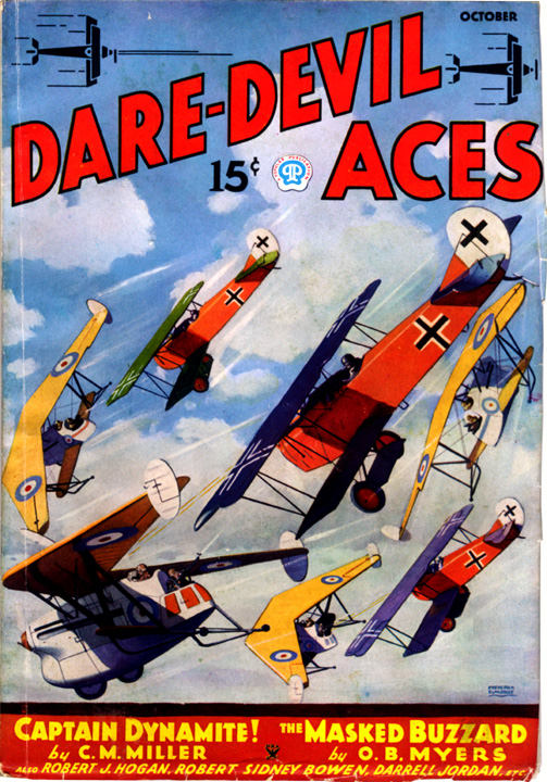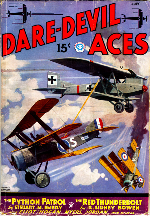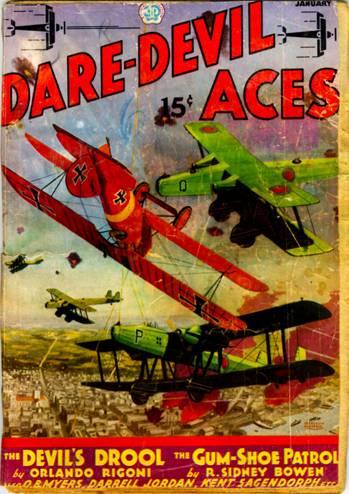 The covers to Dare-Devil Aces magazines were rarely specific to a particular story appearing inside, so when we got into doing reprints we had to decide if we wanted full-color but generic covers to our books, or character-specific covers with a limited palette. We opted to use Blakeslee’s black and white illustrations and give each book a signature color, which has become our trademark. But with a website we can now display some of these sensational covers that ended up on the cutting room floor (albeit in 2mil mylar with buffered backing boards).