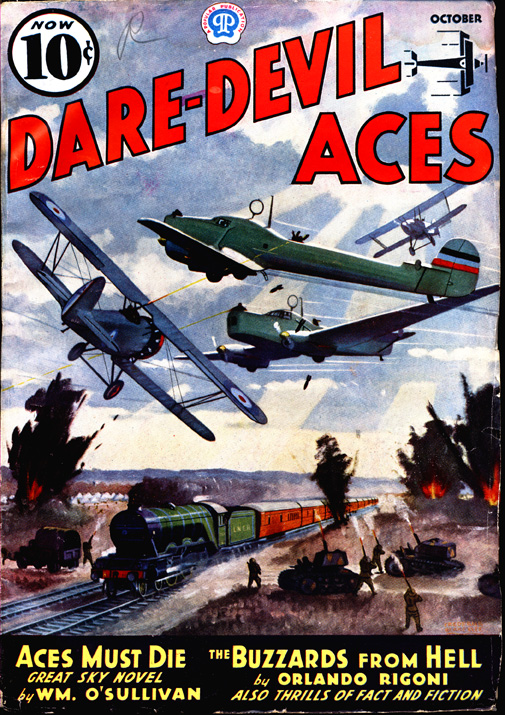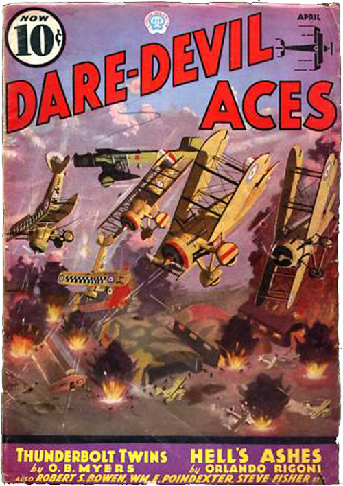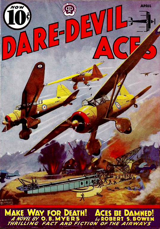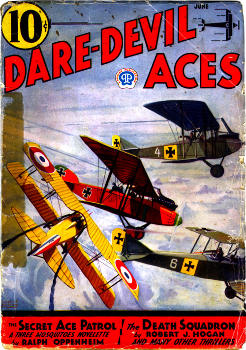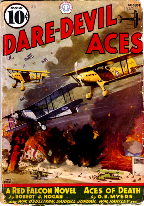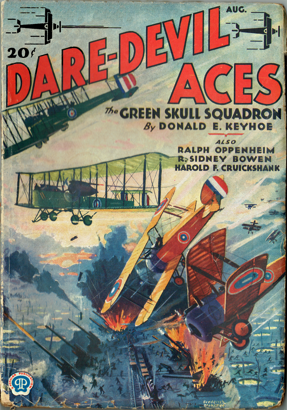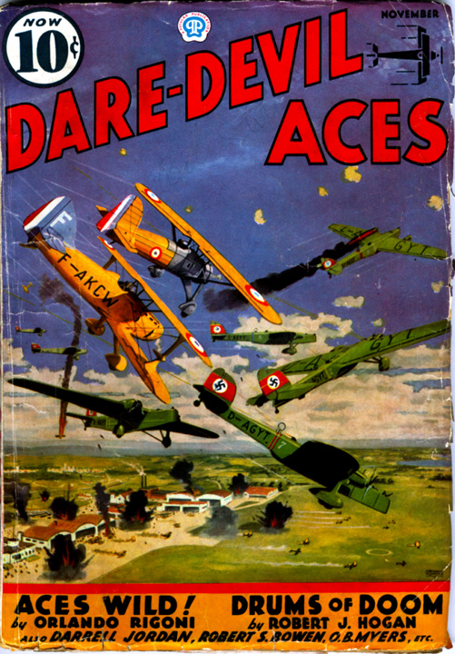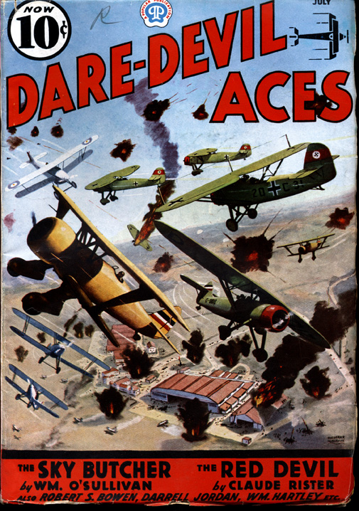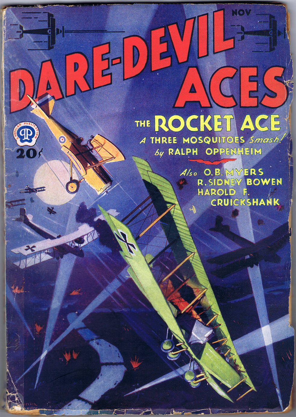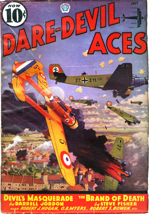 The covers to Dare-Devil Aces magazines were rarely specific to a particular story appearing inside, so when we got into doing reprints we had to decide if we wanted full-color but generic covers to our books, or character-specific covers with a limited palette. We opted to use Blakeslee’s black and white illustrations and give each book a signature color, which has become our trademark. But with a website we can now display some of these sensational covers that ended up on the cutting room floor (albeit in 2mil mylar with buffered backing boards).