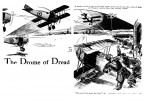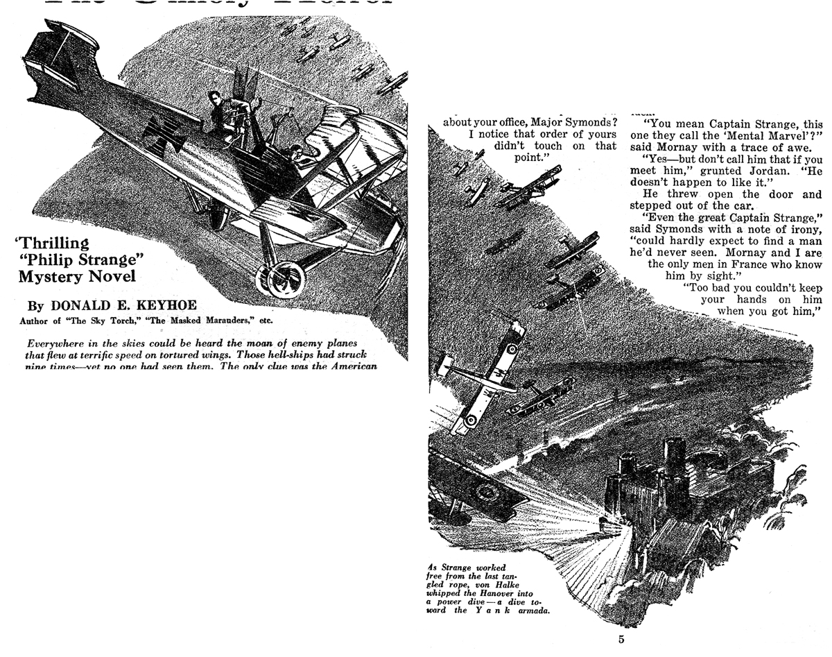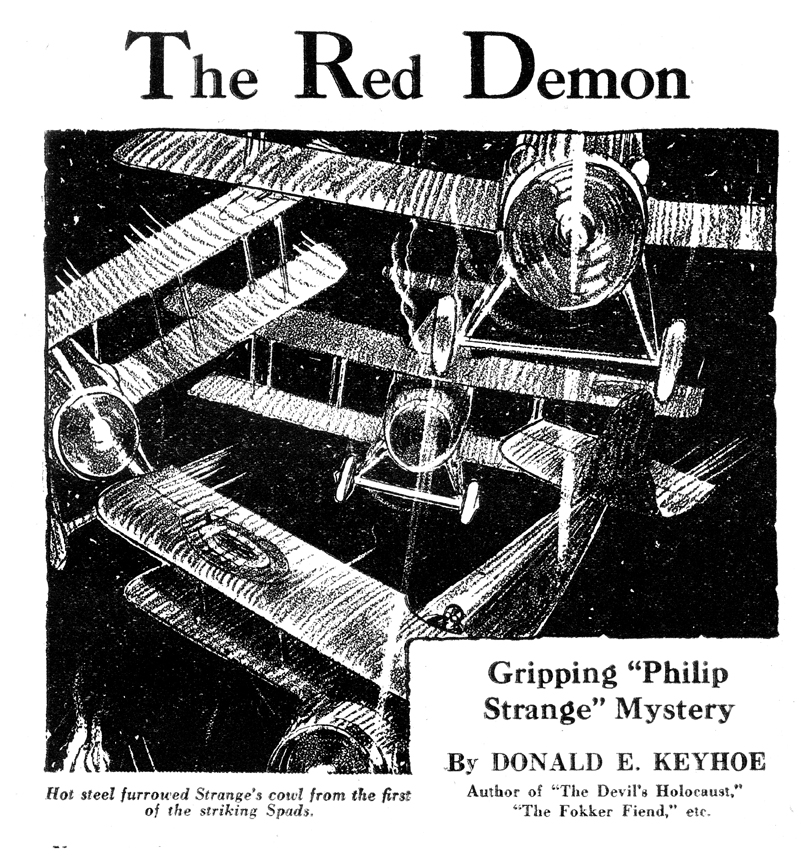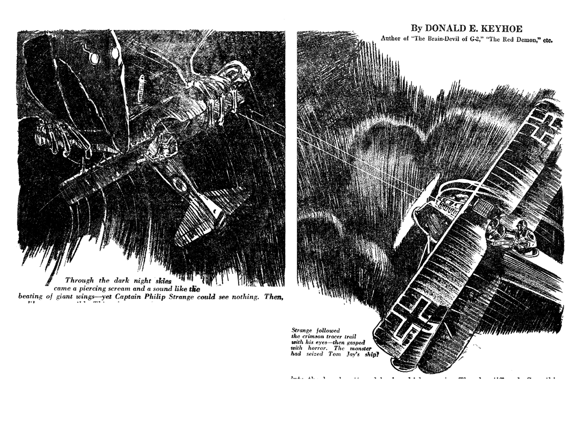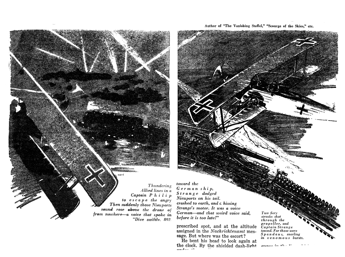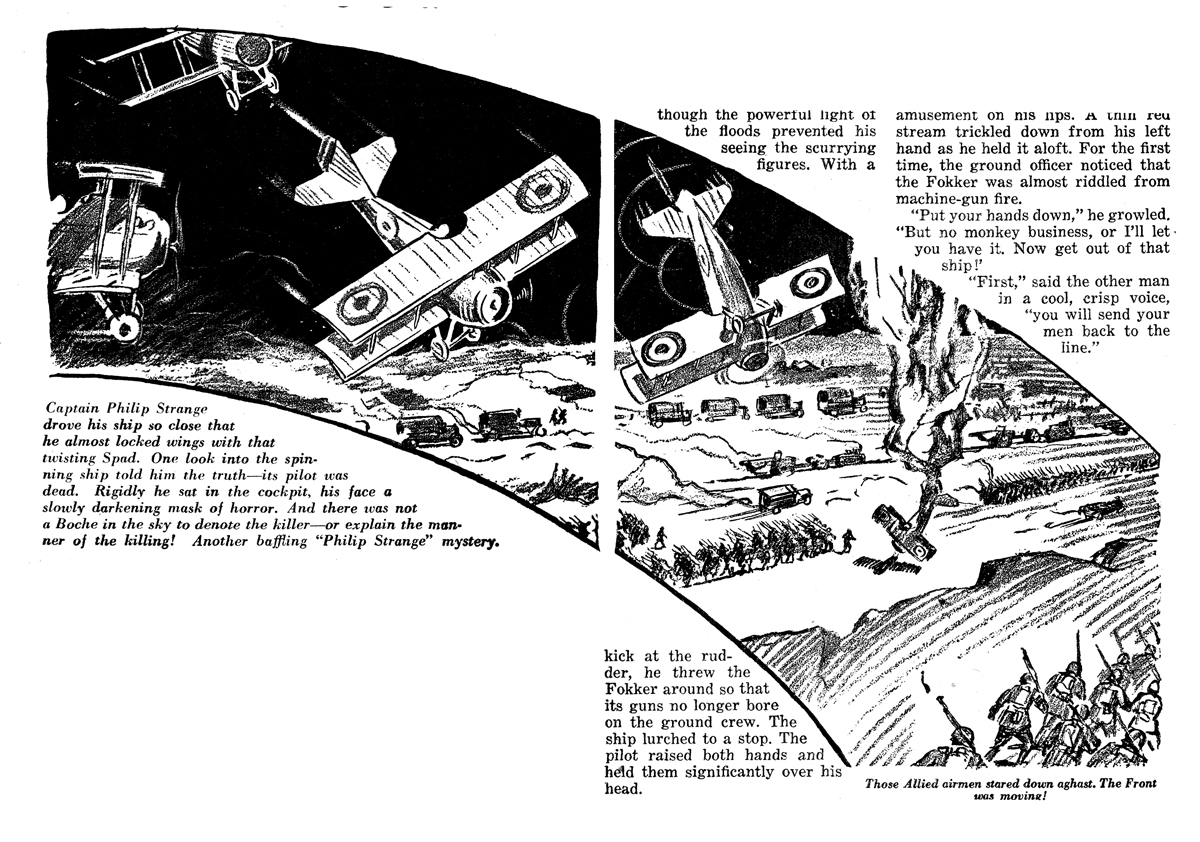 The original pulp stories were illustrated buy Eugene M. Frandzen. In our design the orignal art is used as a background seen only through the graphic cutouts that serve to lead off each story. Here is Frandzen’s art as it appeared in the pages of Flying Aces magazine.