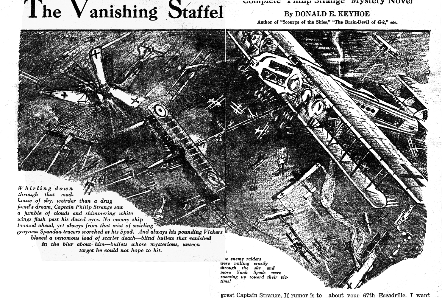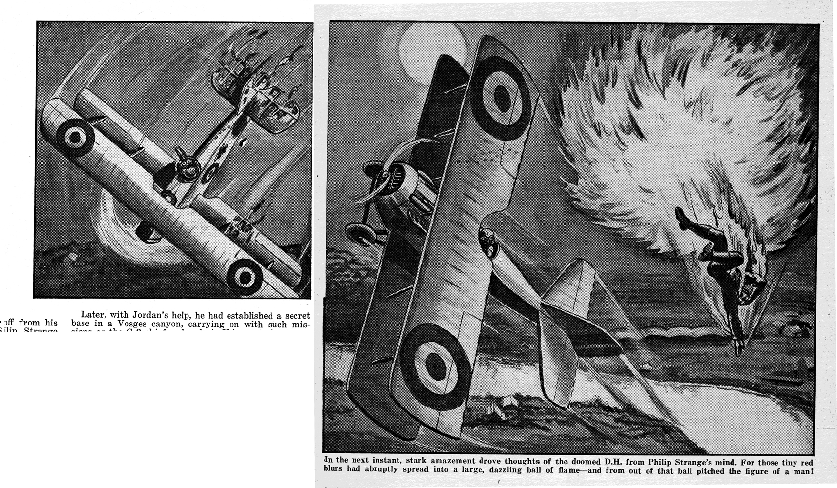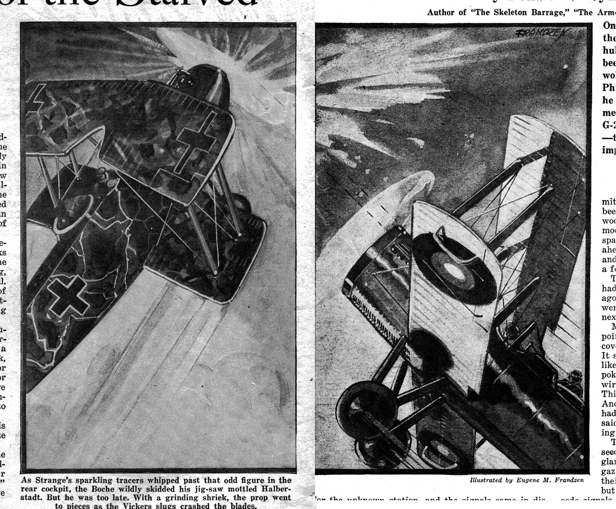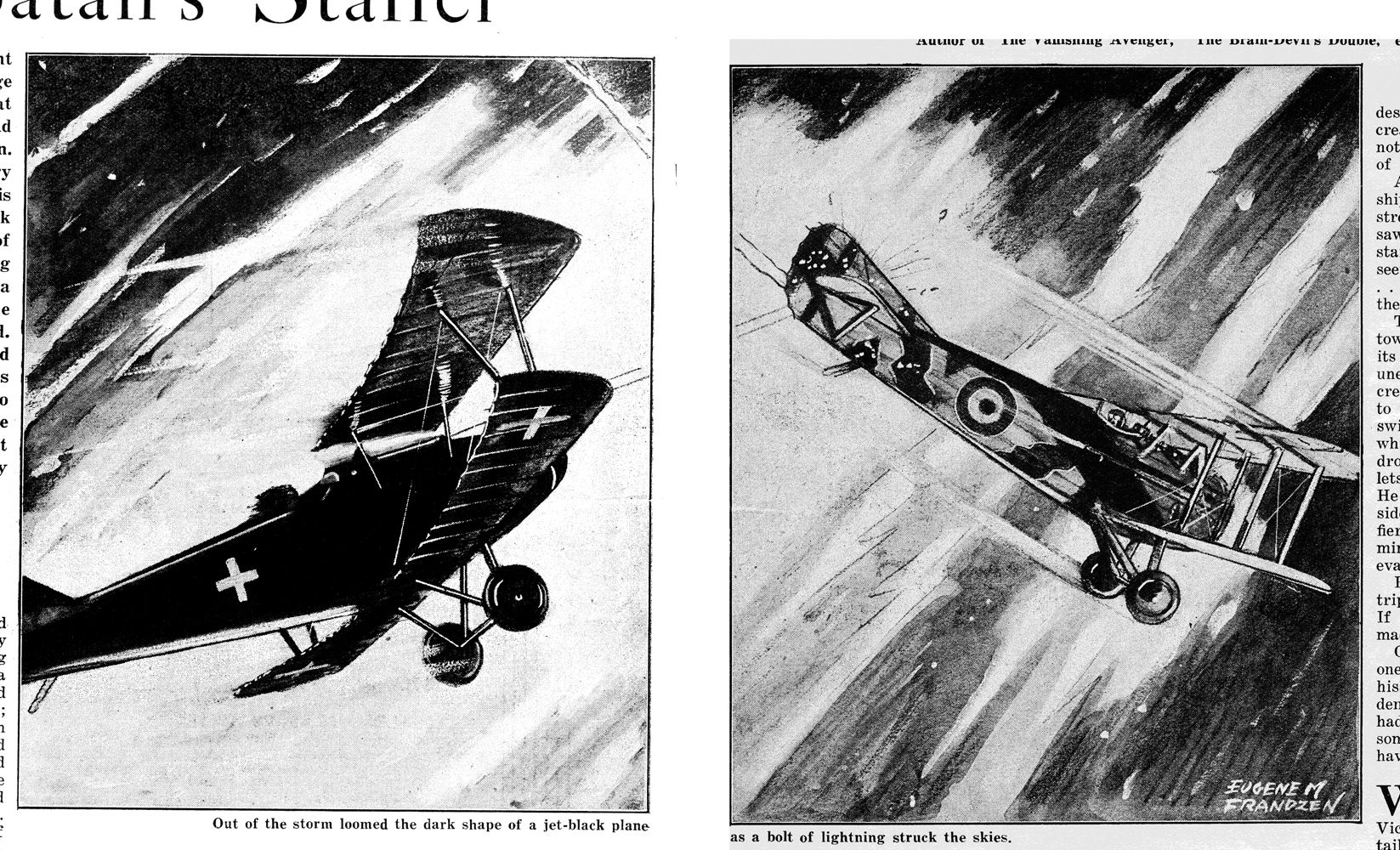 The original pulp stories were illustrated buy Eugene M. Frandzen. In our design the orignal art is used as a background seen only through the graphic cutouts that serve to lead off each story. Here is Frandzen’s art as it appeared in the pages of Flying Aces magazine.