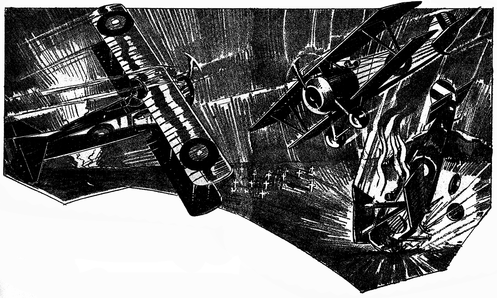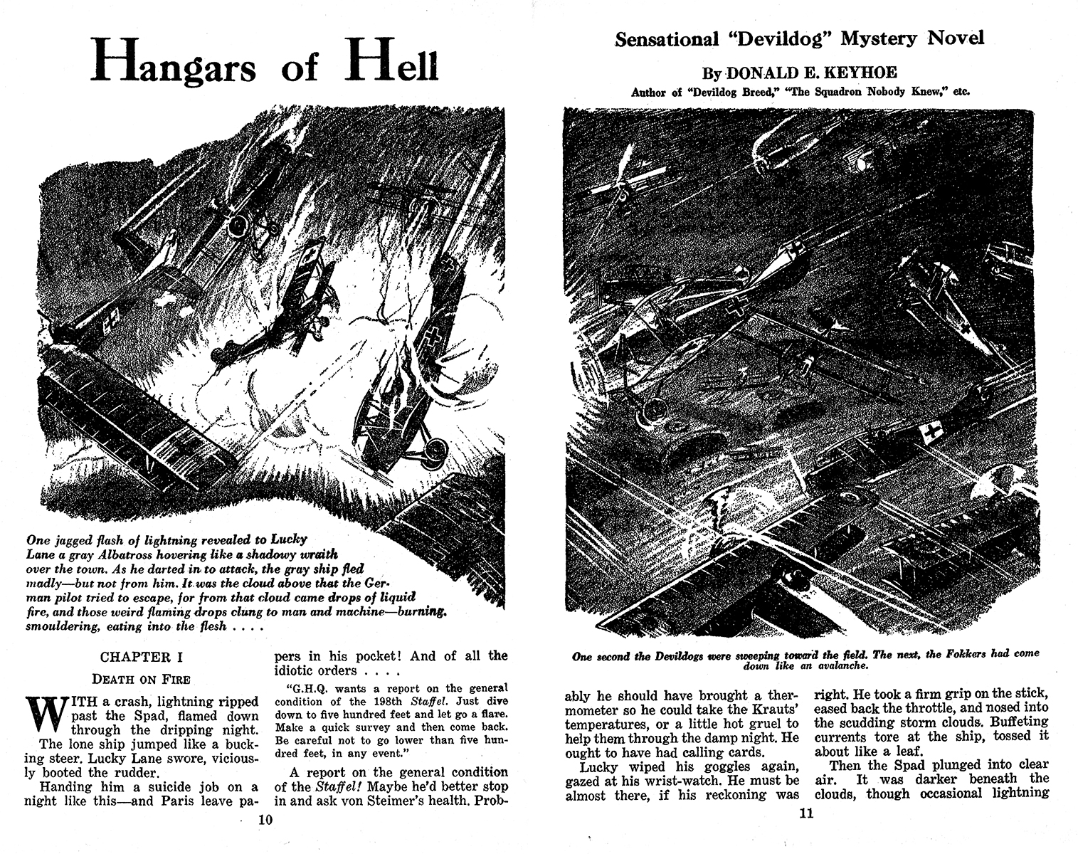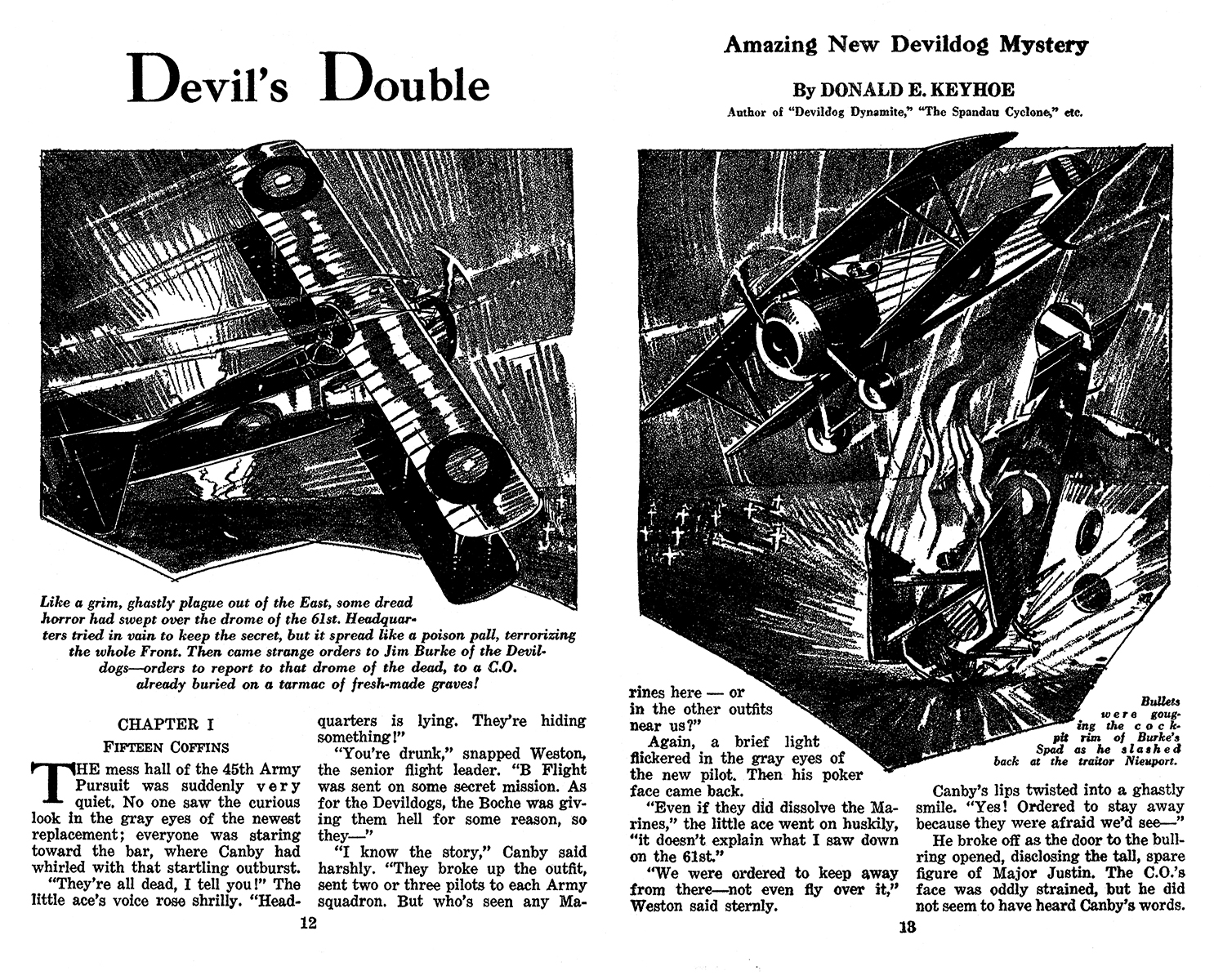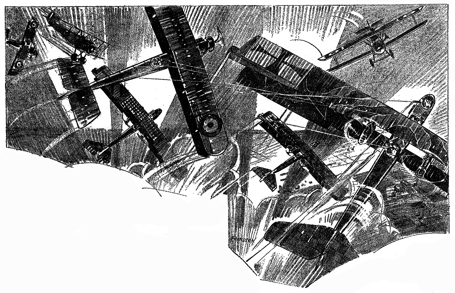 The original pulp stories were illustrated buy Eugene M. Frandzen. In our design the orignal art is used as a background seen only through the graphic cutouts that serve to lead off each story. Here is Frandzen’s art as it appeared in the pages of Sky Birds magazine!