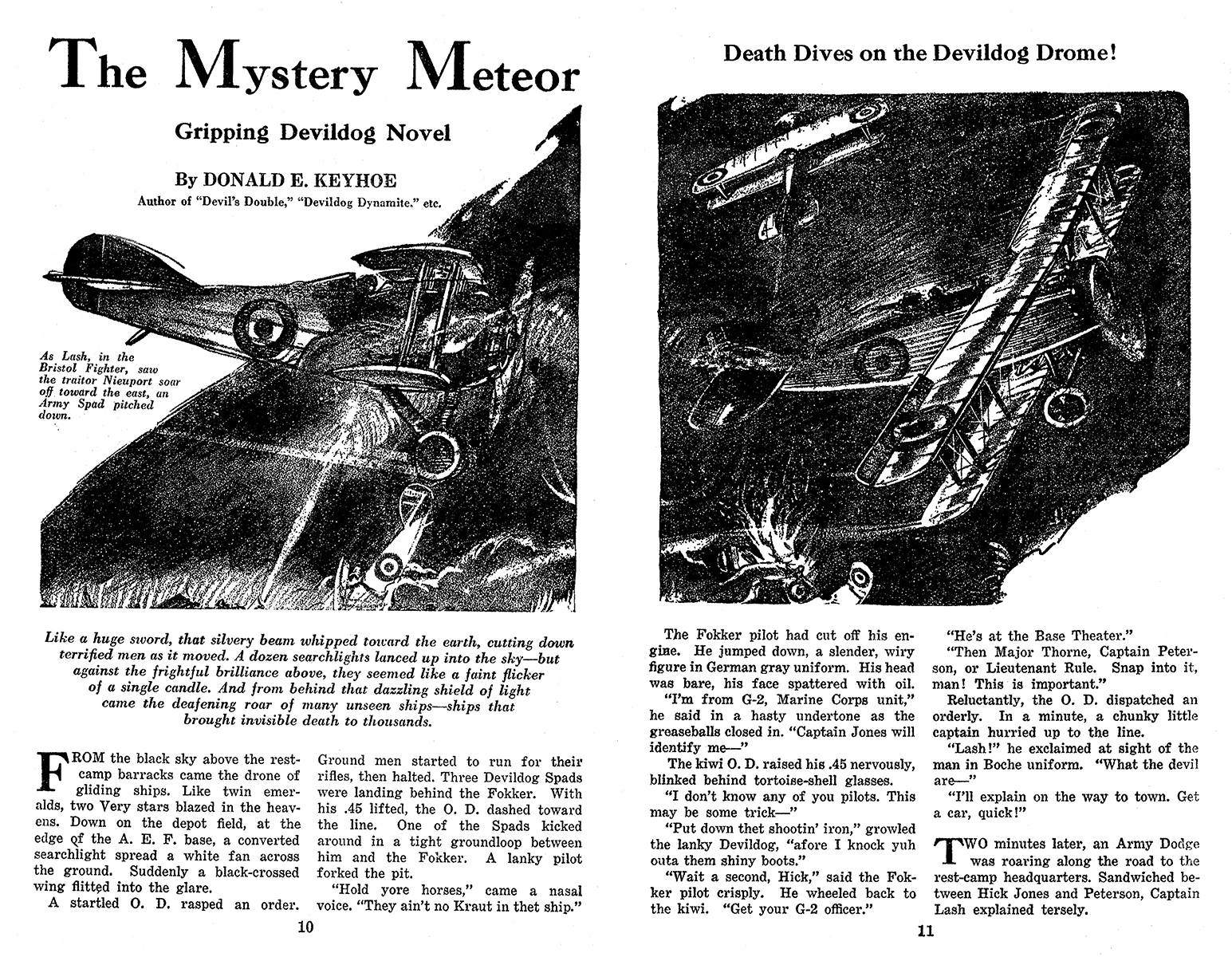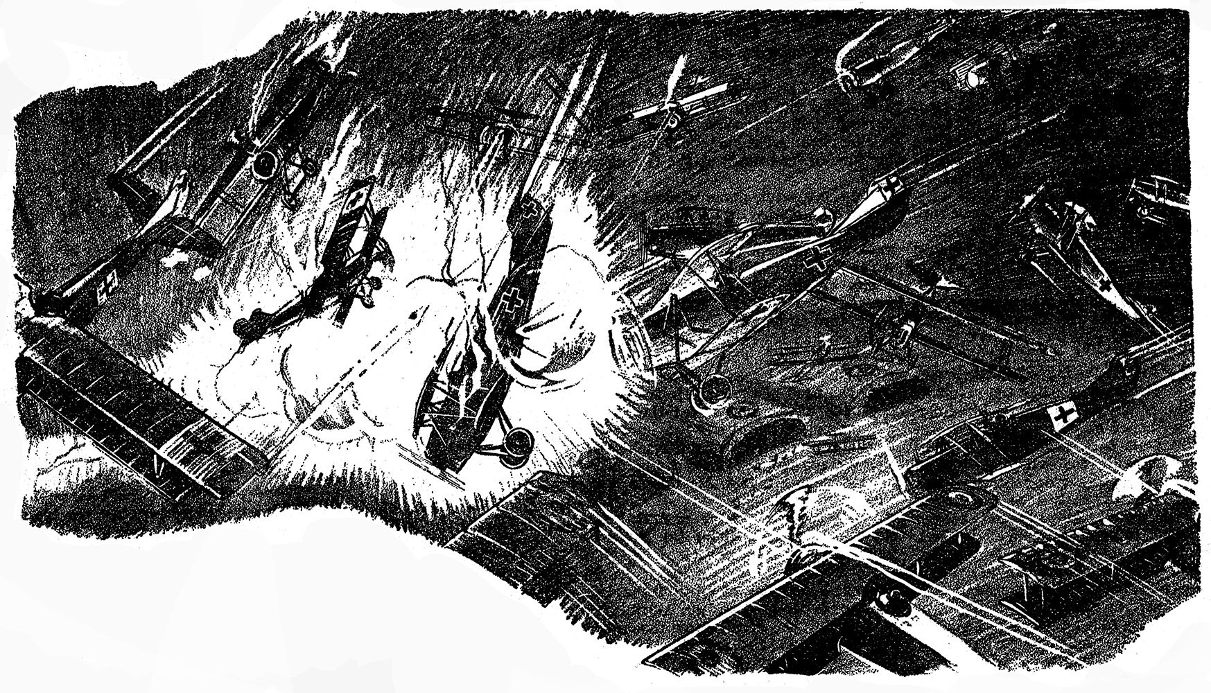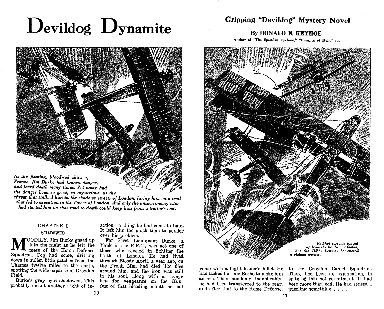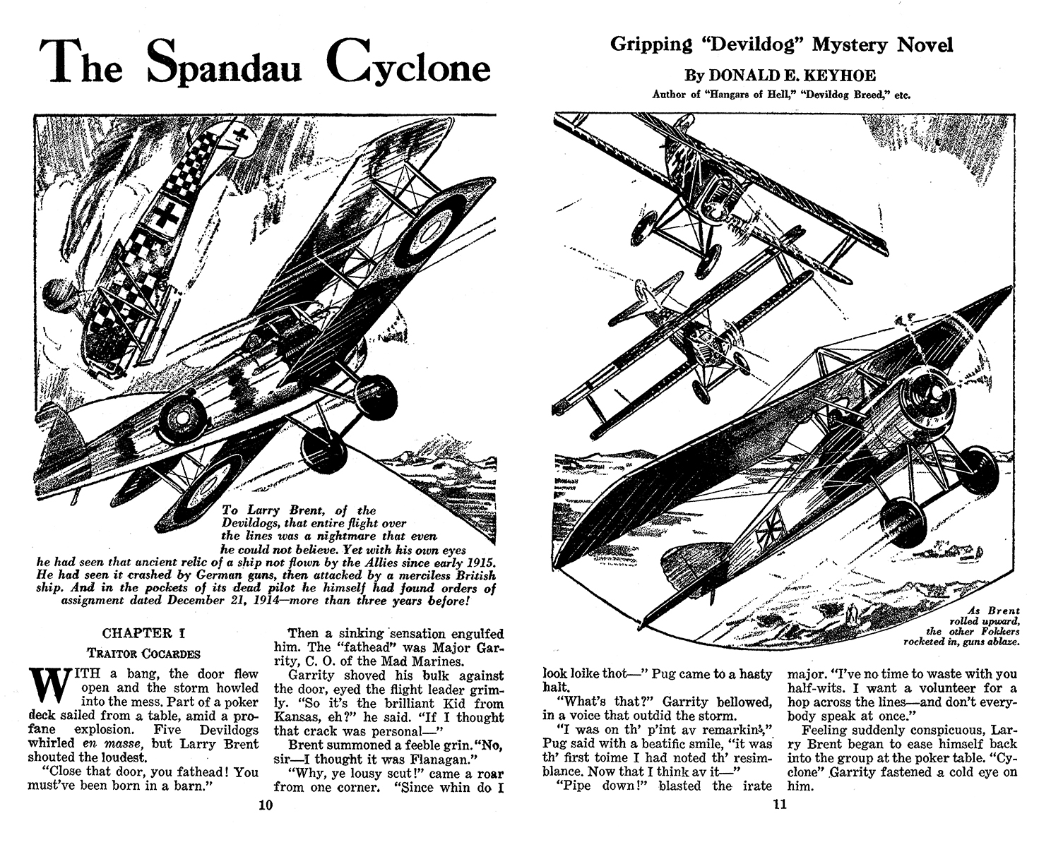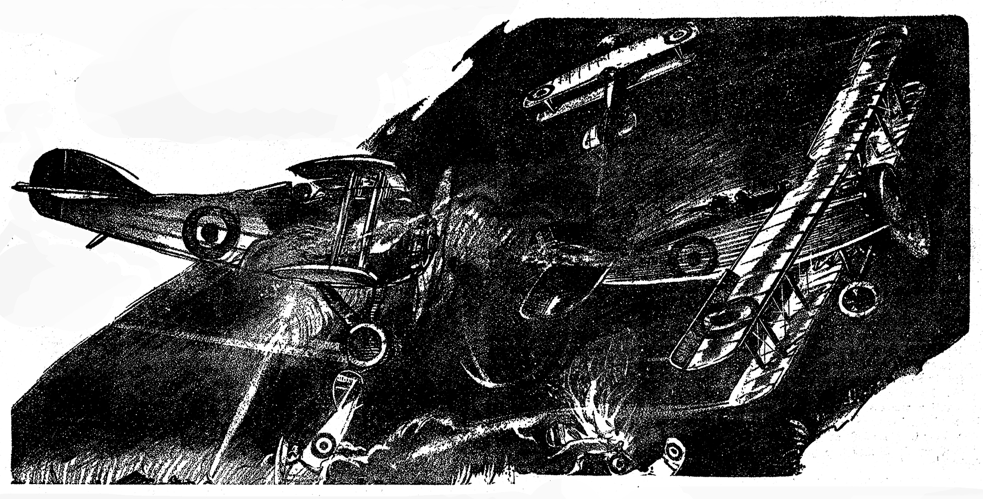 The original pulp stories were illustrated buy Eugene M. Frandzen. In our design the orignal art is used as a background seen only through the graphic cutouts that serve to lead off each story. Here is Frandzen’s art as it appeared in the pages of Sky Birds magazine!