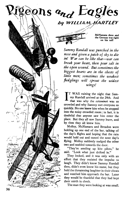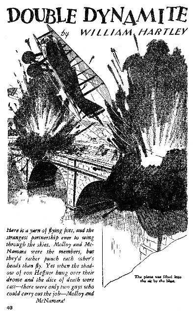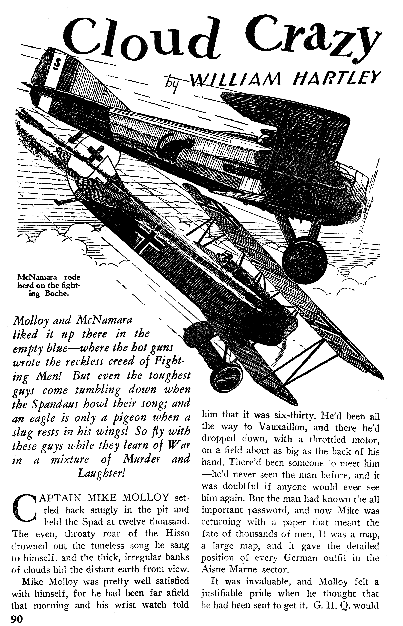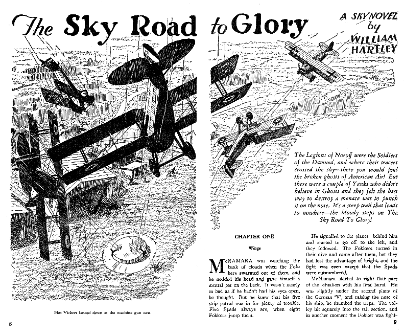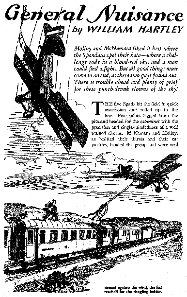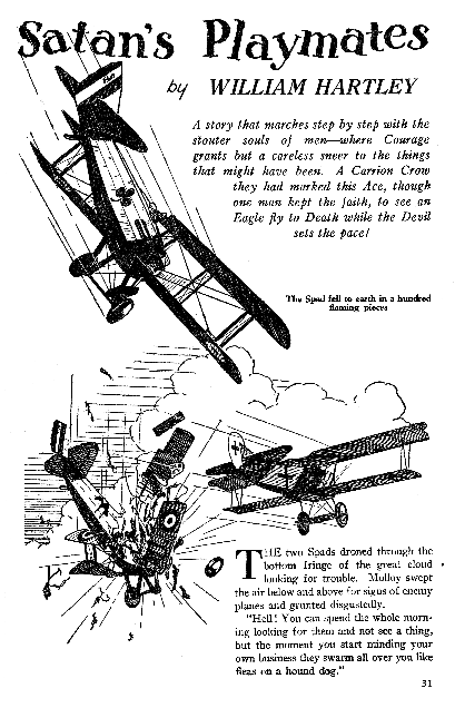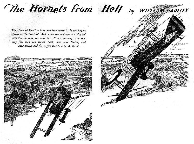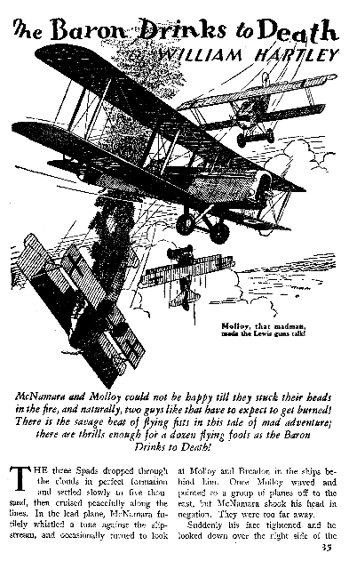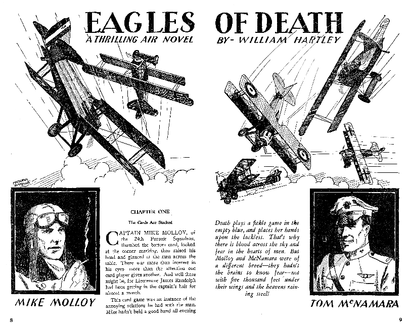 While all of the Age of Aces aviation titles feature the original artwork for each story, it has been modified to better fit our book designs. In general, the original artwork flowed around the opening of the adventure, but in our volumes it’s expanded to fill an entire page or spread to serve as a “cover†to the story. Also, to unify the book we run the story’s title in our own font, stripping out the lettering done by the artist. Here on the web though we can offer a “dvd extra†of sorts — the full, unmodified artwork as it originally appeared in the pulp.