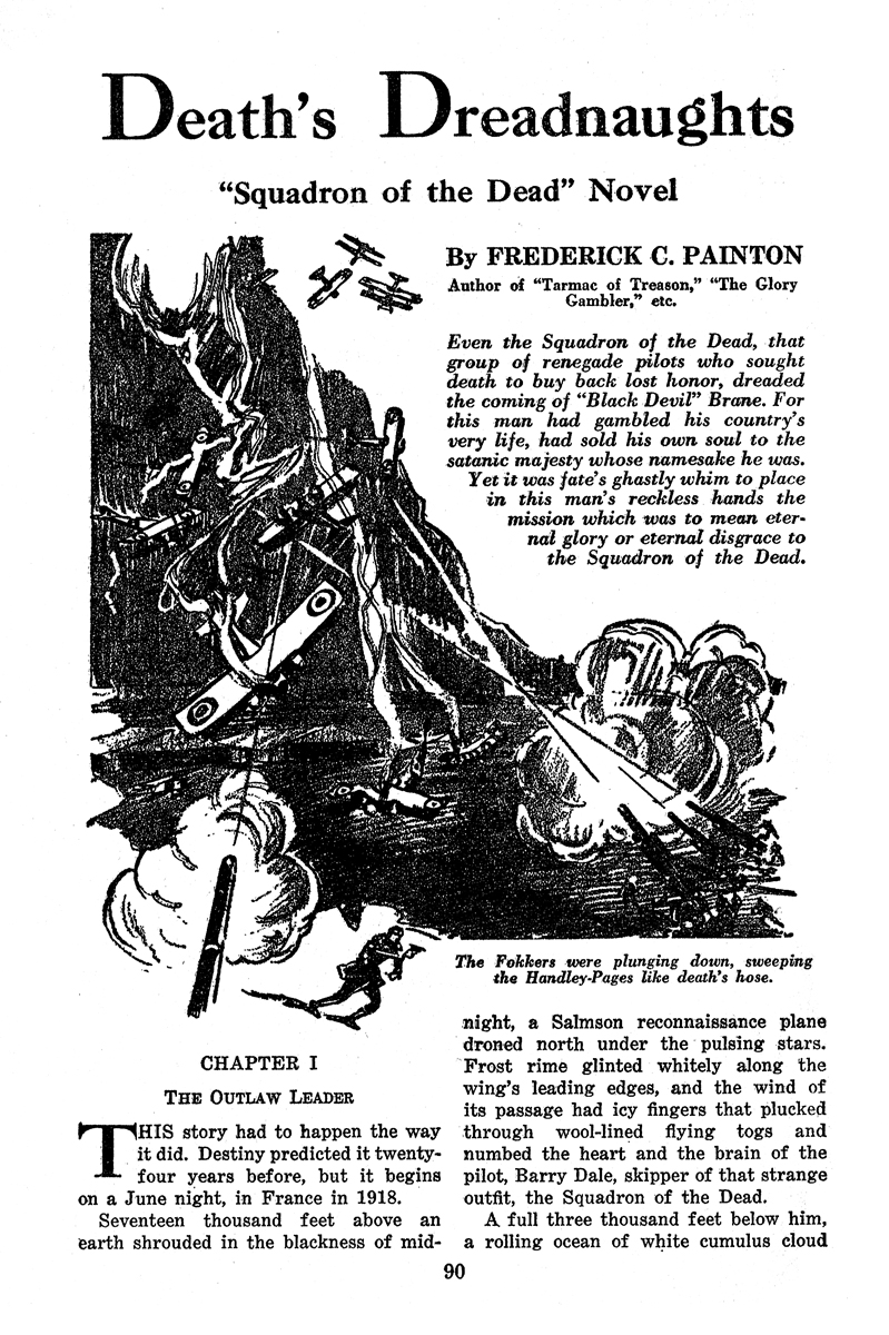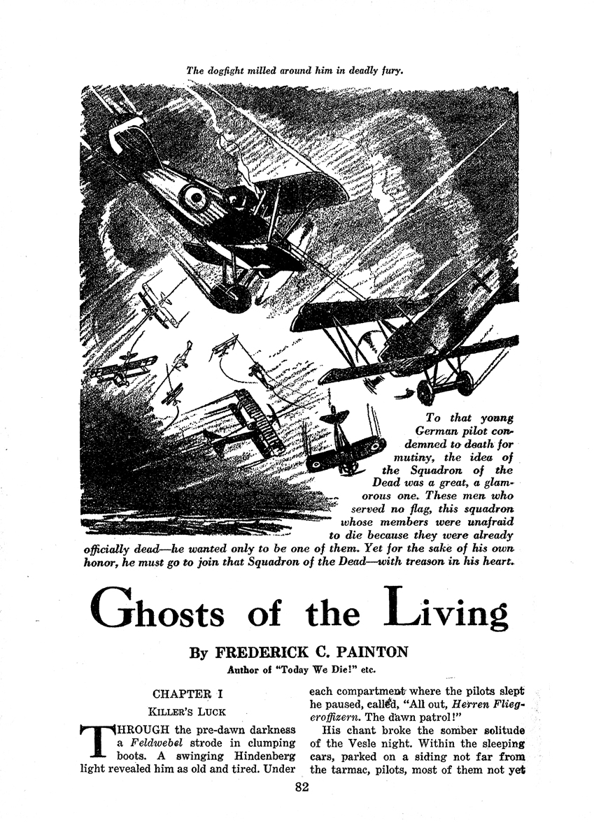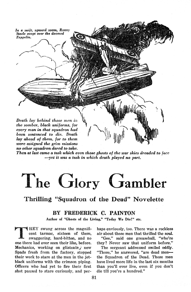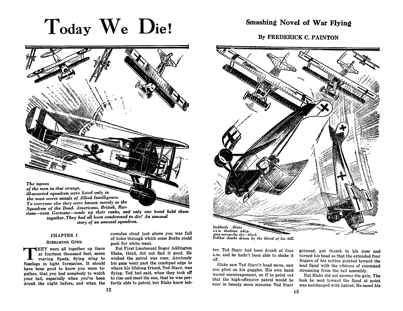 While all of the Age of Aces aviation titles feature the original artwork for each story, it has been modified to better fit our book designs. In general, the original artwork flowed around the opening of the adventure, but in our volumes it’s expanded to fill an entire page or spread to serve as a “cover†to the story. Also, to unify the book we run the story’s title in our own font, stripping out the lettering done by the artist. Here on the web though we can offer a “dvd extra†of sorts — the full, unmodified artwork as it originally appeared in the pulp.