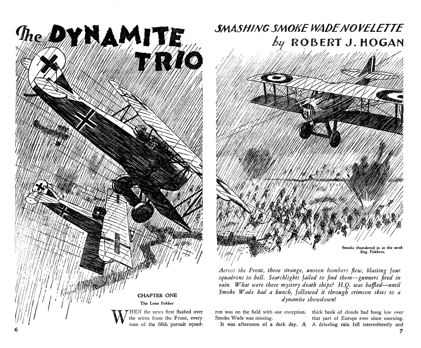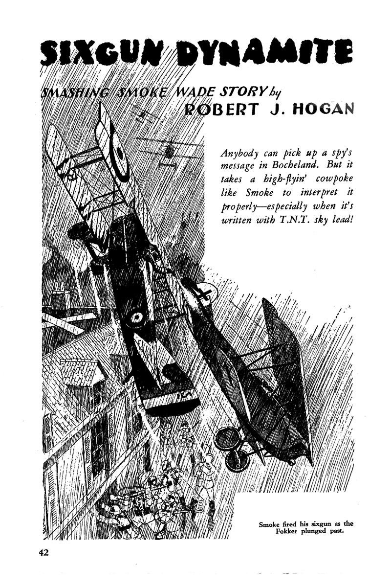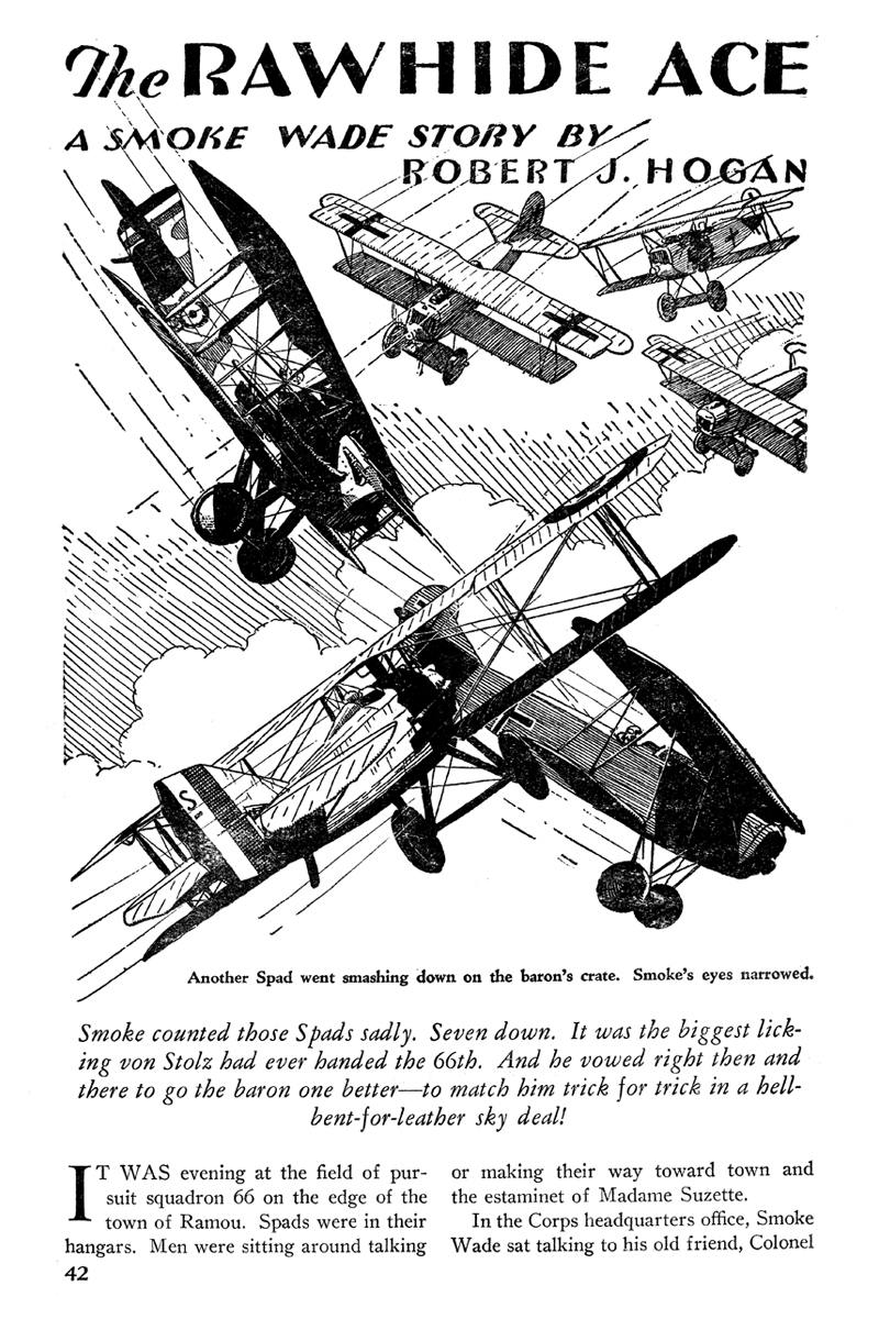 While all of the Age of Aces aviation titles feature the original artwork for each story, it has been modified to better fit our book designs. In general, the original artwork flowed around the opening of the adventure, but in our volumes it’s expanded to fill an entire page or spread to serve as a “cover†to the story. Also, to unify the book we run the story’s title in our own font, stripping out the lettering done by the artist. Here on the web though we can offer a “dvd extra†of sorts—the full, unmodified artwork as it originally appeared in the pulp.