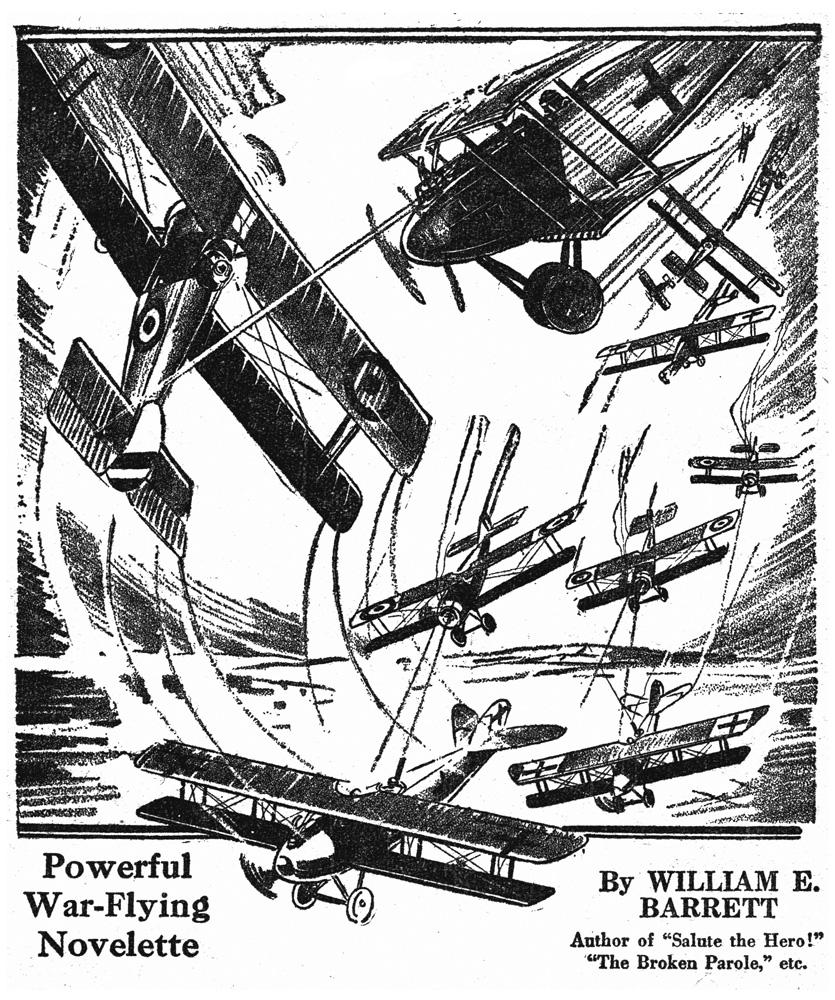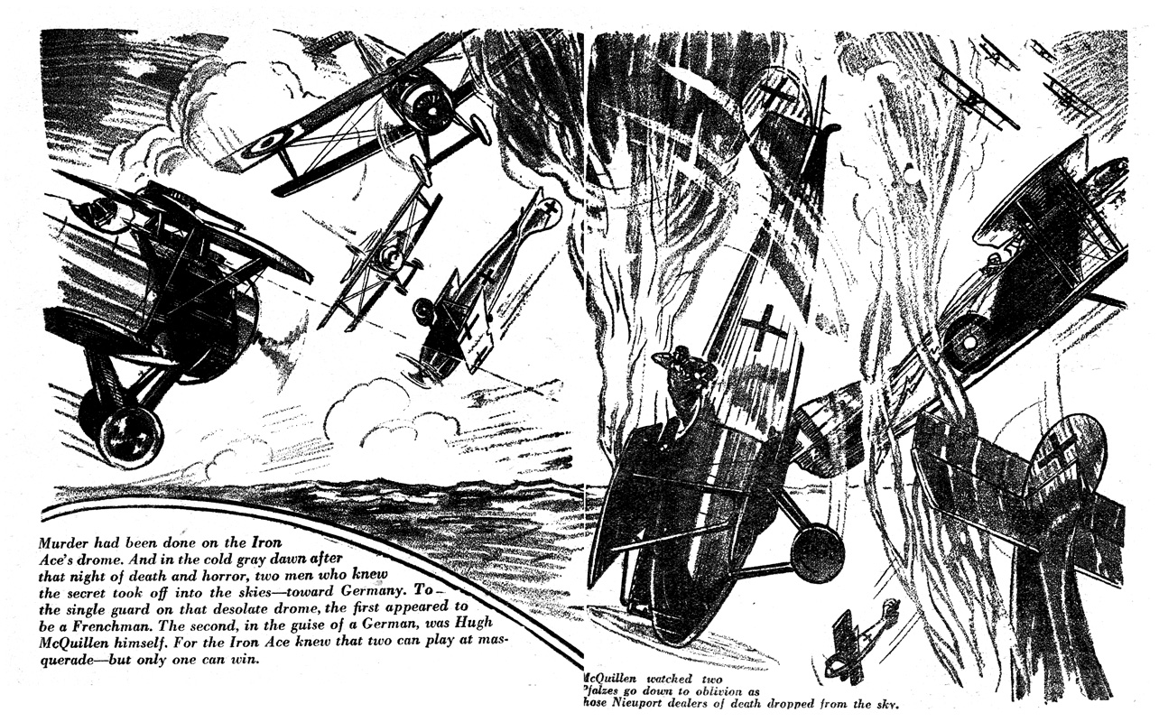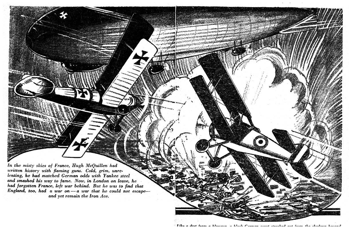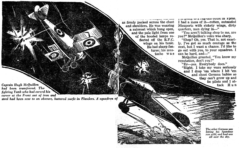 While all of the Age of Aces aviation titles feature the original artwork for each story, it has been modified to better fit our book designs. In general, the original artwork flowed around the opening of the adventure, but in our volumes it’s expanded to fill an entire page or spread to serve as a “cover†to the story. Also, to unify the book we run the story’s title in our own font, stripping out the lettering done by the artist. Here on the web though we can offer a “dvd extra†of sorts — the full, unmodified artwork as it originally appeared in the pulp.