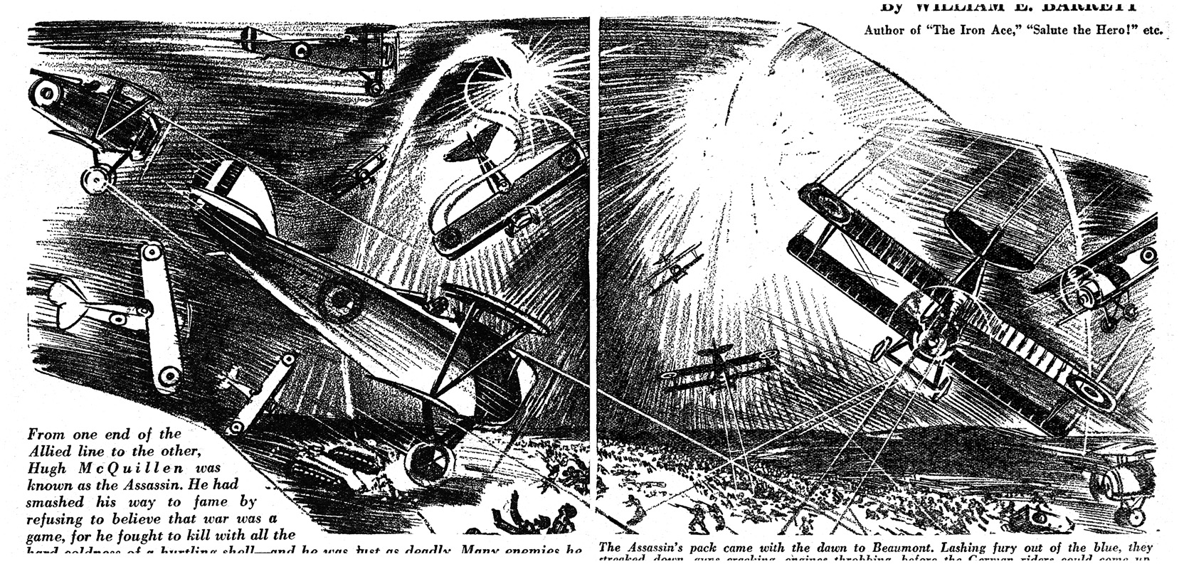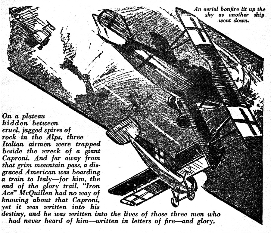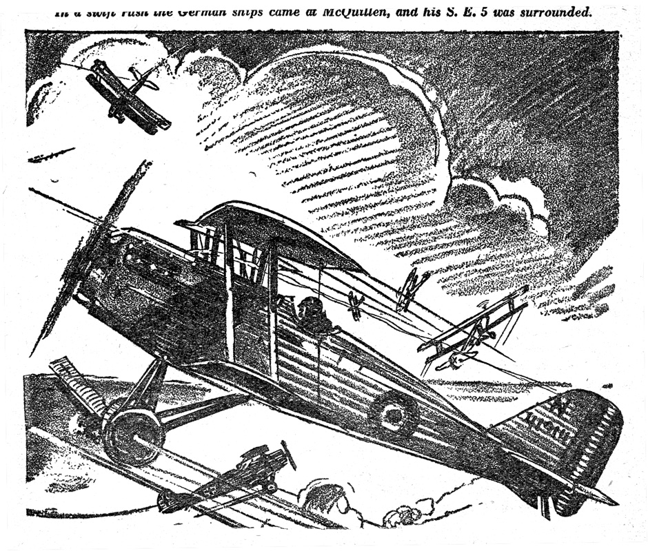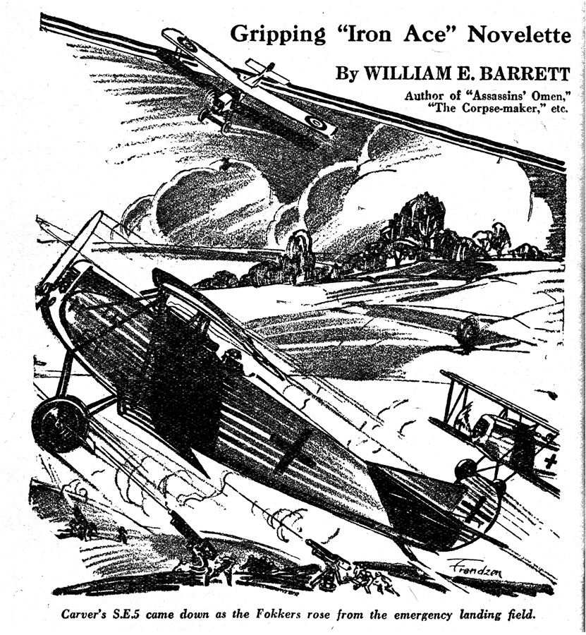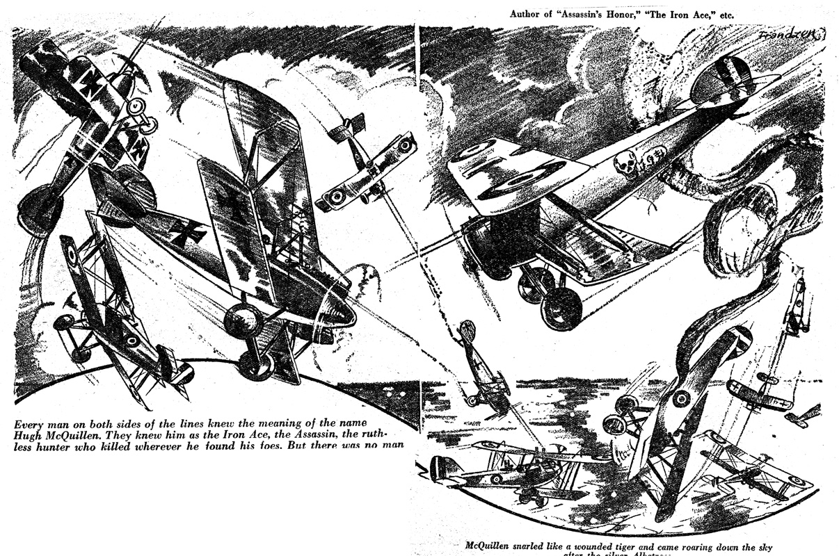 While all of the Age of Aces aviation titles feature the original artwork for each story, it has been modified to better fit our book designs. In general, the original artwork flowed around the opening of the adventure, but in our volumes it’s expanded to fill an entire page or spread to serve as a “cover†to the story. Also, to unify the book we run the story’s title in our own font, stripping out the lettering done by the artist. Here on the web though we can offer a “dvd extra†of sorts — the full, unmodified artwork as it originally appeared in the pulp.