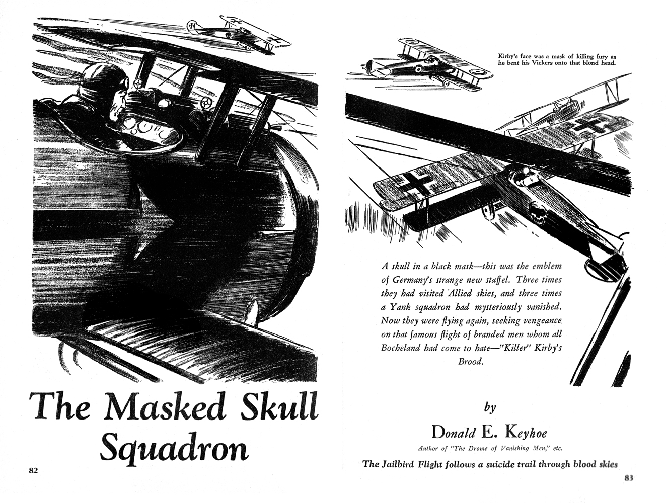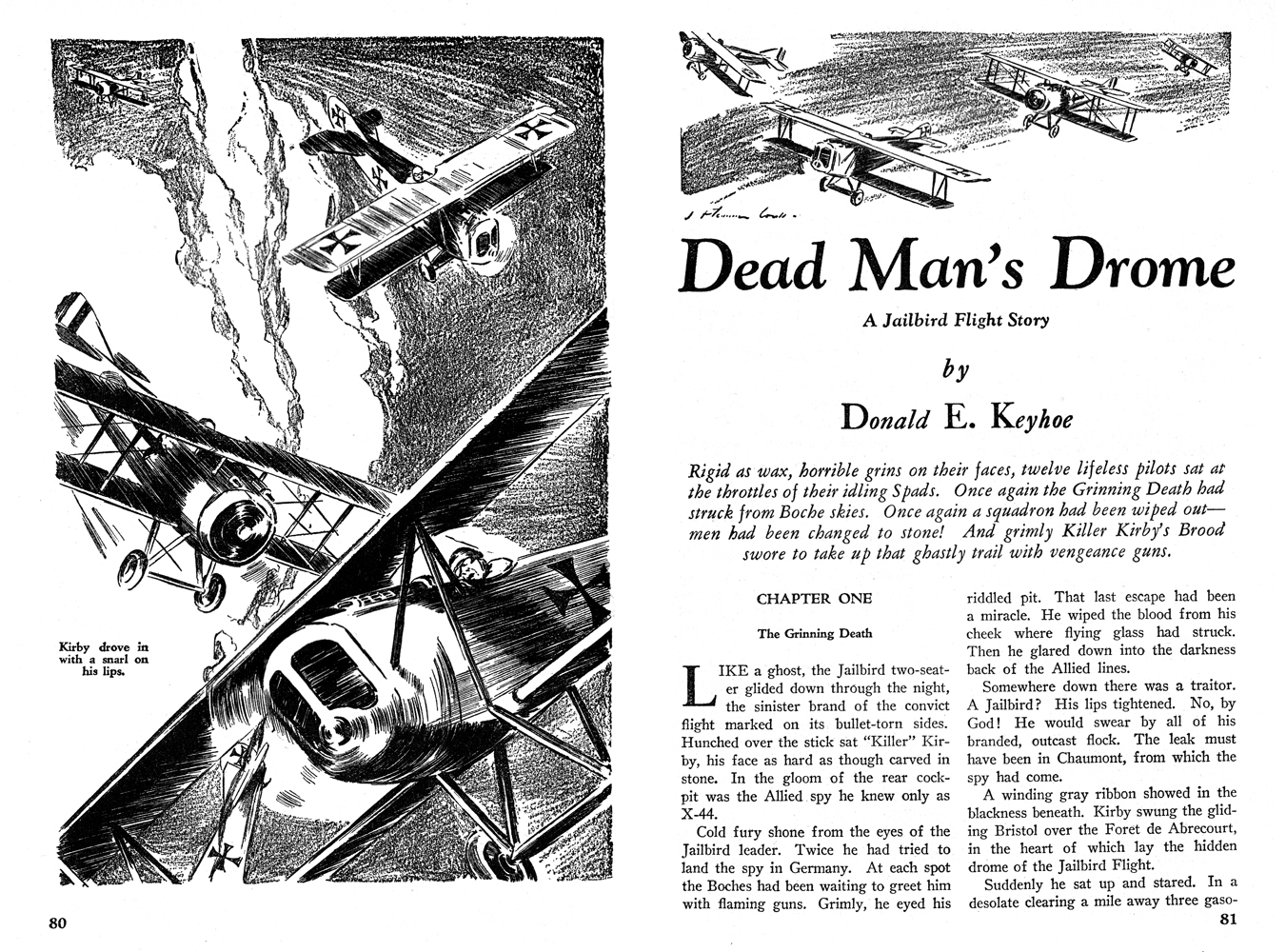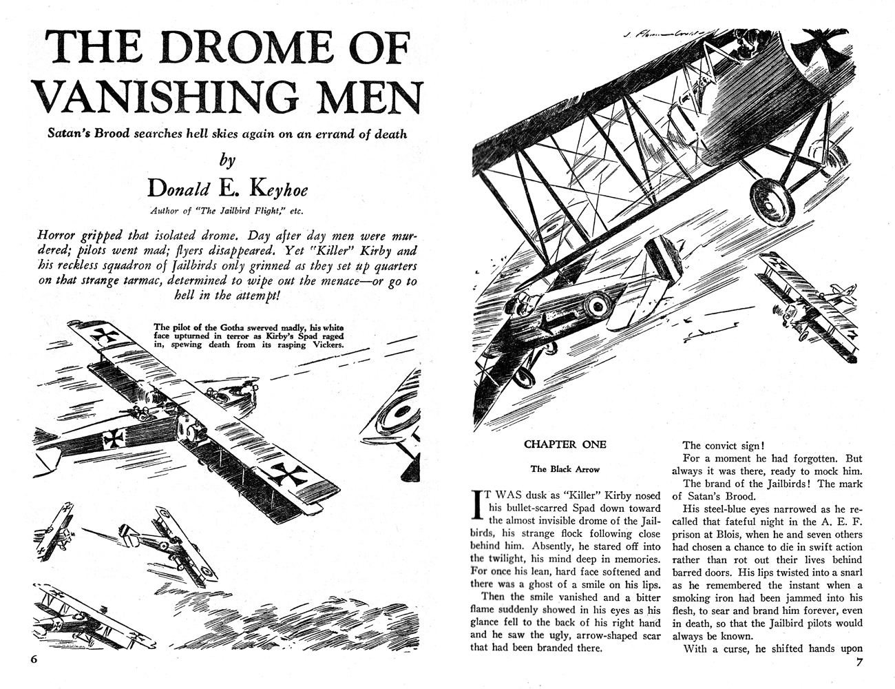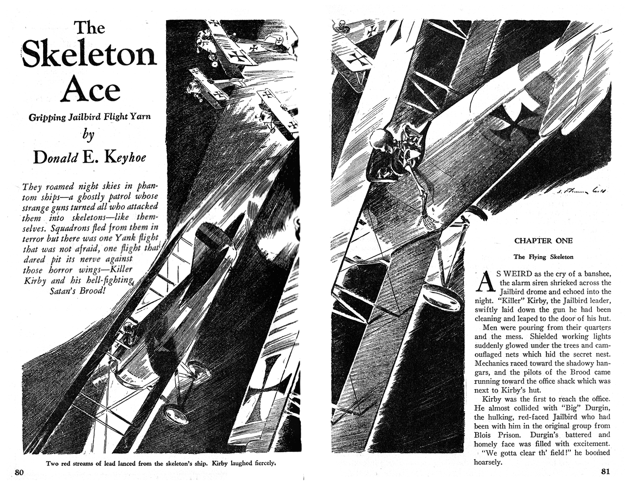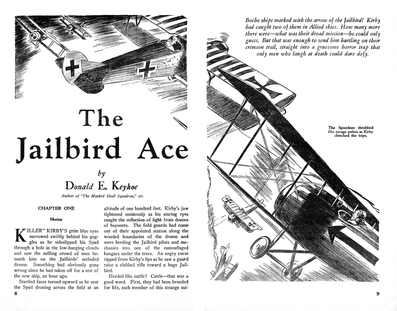 While all of the Age of Aces aviation titles feature the original artwork for each story, it has been modified to better fit our book designs. In general, the original artwork flowed around the opening of the adventure, but in our volumes it’s expanded to fill an entire page or spread to serve as a “cover†to the story. Also, to unify the book we run the story’s title in our own font, stripping out the lettering done by the artist. Here on the web though we can offer a “dvd extra†of sorts — the full, unmodified artwork as it originally appeared in the pulp.