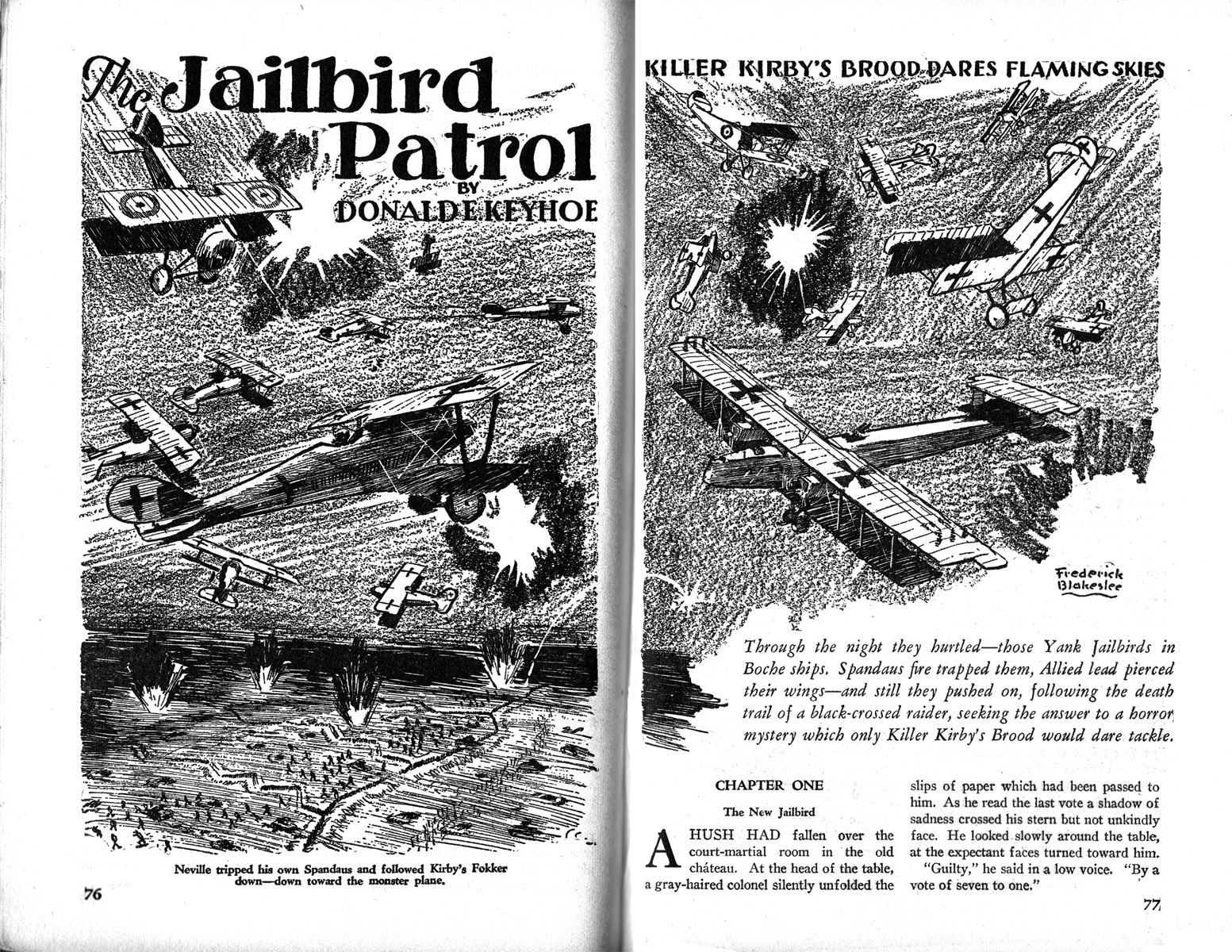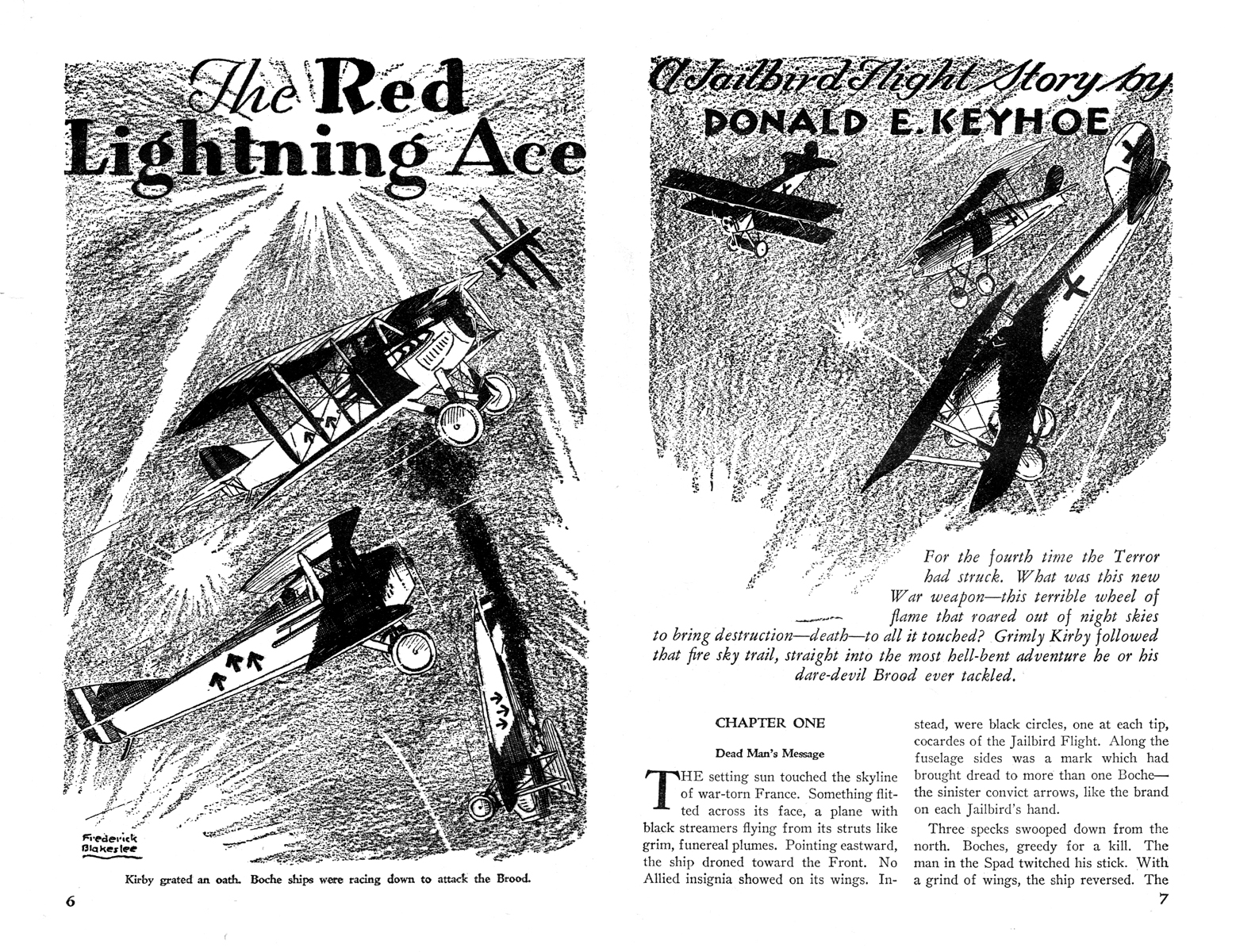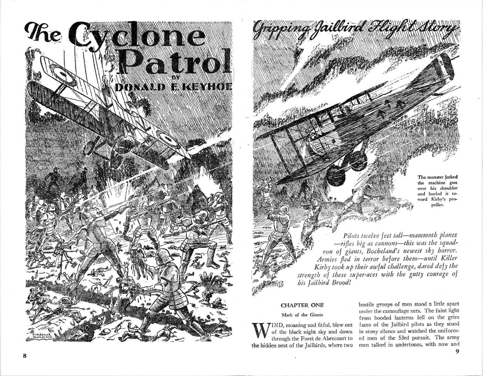 While all of the Age of Aces aviation titles feature the original artwork for each story, it has been modified to better fit our book designs. In general, the original artwork flowed around the opening of the adventure, but in our volumes it’s expanded to fill an entire page or spread to serve as a “cover†to the story. Also, to unify the book we run the story’s title in our own font, stripping out the lettering done by the artist. Here on the web though we can offer a “dvd extra†of sorts — the full, unmodified artwork as it originally appeared in the pulp.