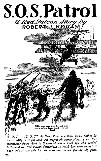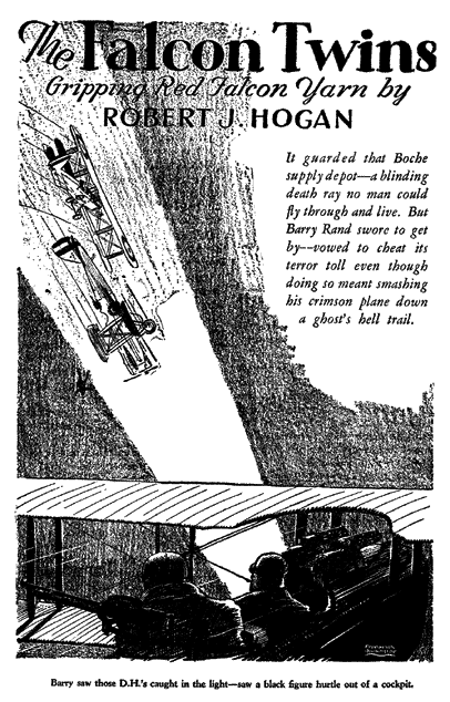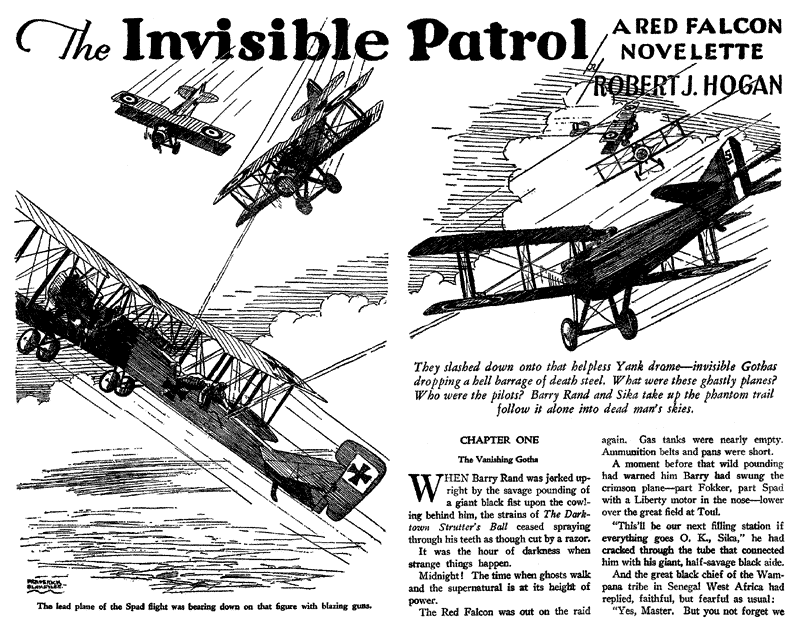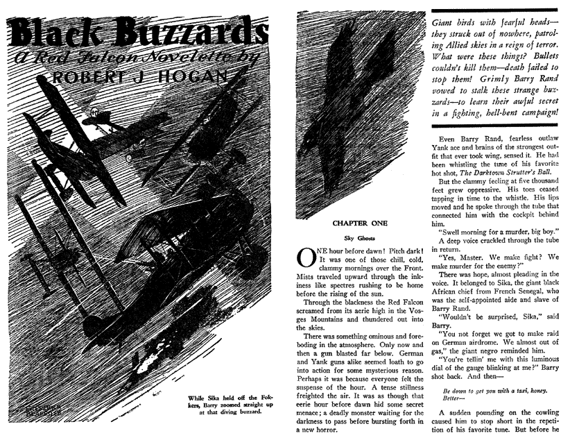 While all of the Age of Aces aviation titles feature the original artwork for each story, it has been modified to better fit our book designs. In general, the original artwork flowed around the opening of the adventure, but in our volumes it’s expanded to fill an entire page or spread to serve as a “cover†to the story. Also, to unify the book we run the story’s title in our own font, stripping out the lettering done by the artist. Here on the web though we can offer a “dvd extra†of sorts — the full, unmodified artwork as it originally appeared in the pulp.