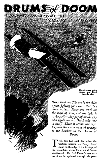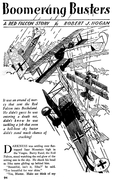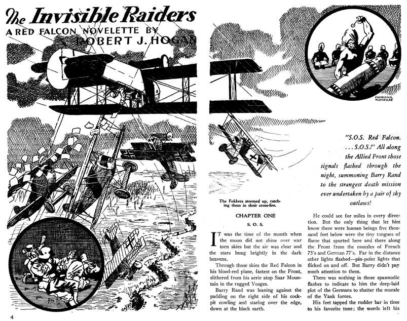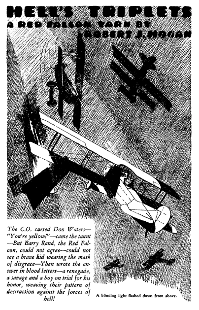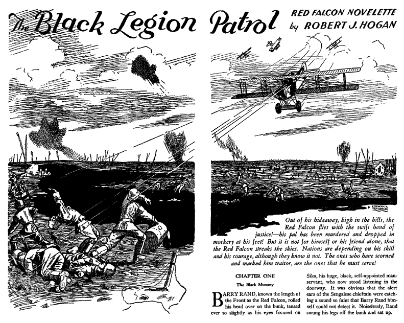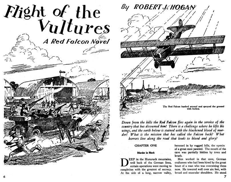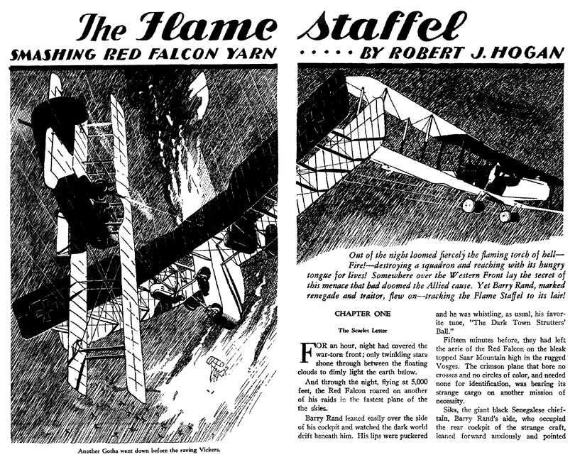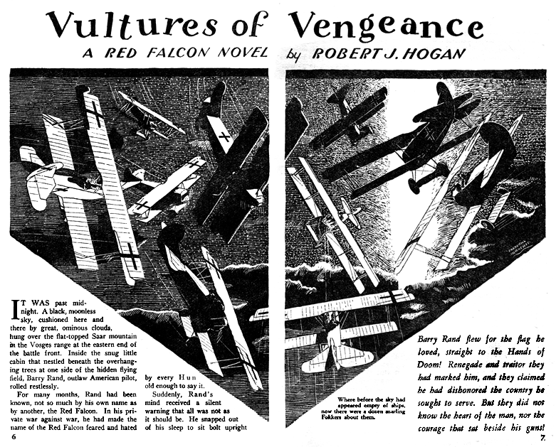 While all of the Age of Aces aviation titles feature the original artwork for each story, it has been modified to better fit our book designs. In general, the original artwork flowed around the opening of the adventure, but in our volumes it’s expanded to fill an entire page or spread to serve as a “cover†to the story. Also, to unify the book we run the story’s title in our own font, stripping out the lettering done by the artist. Here on the web though we can offer a “dvd extra†of sorts — the full, unmodified artwork as it originally appeared in the pulp.