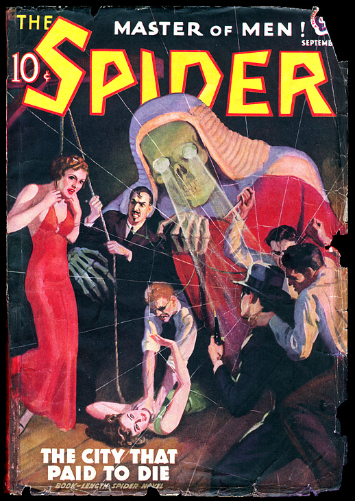 John Newton Howitt’s powerful pulp covers appear in The Spider Vs. The Empire State, but only in black and white. We are excited to be able to show these vibrant works in color here on ageofaces.net.